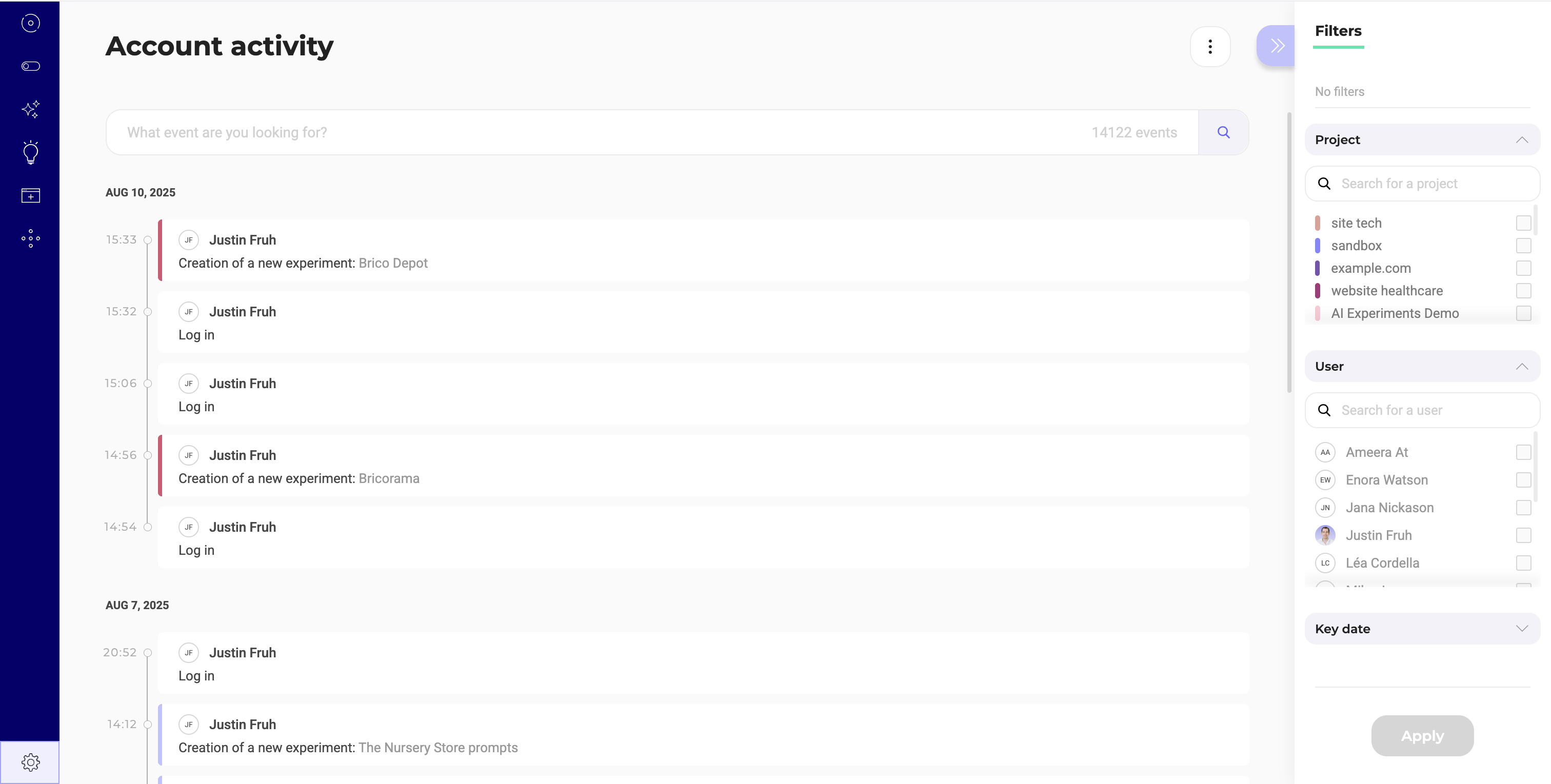To access your Kameleoon account activity, click Admin > Activity.