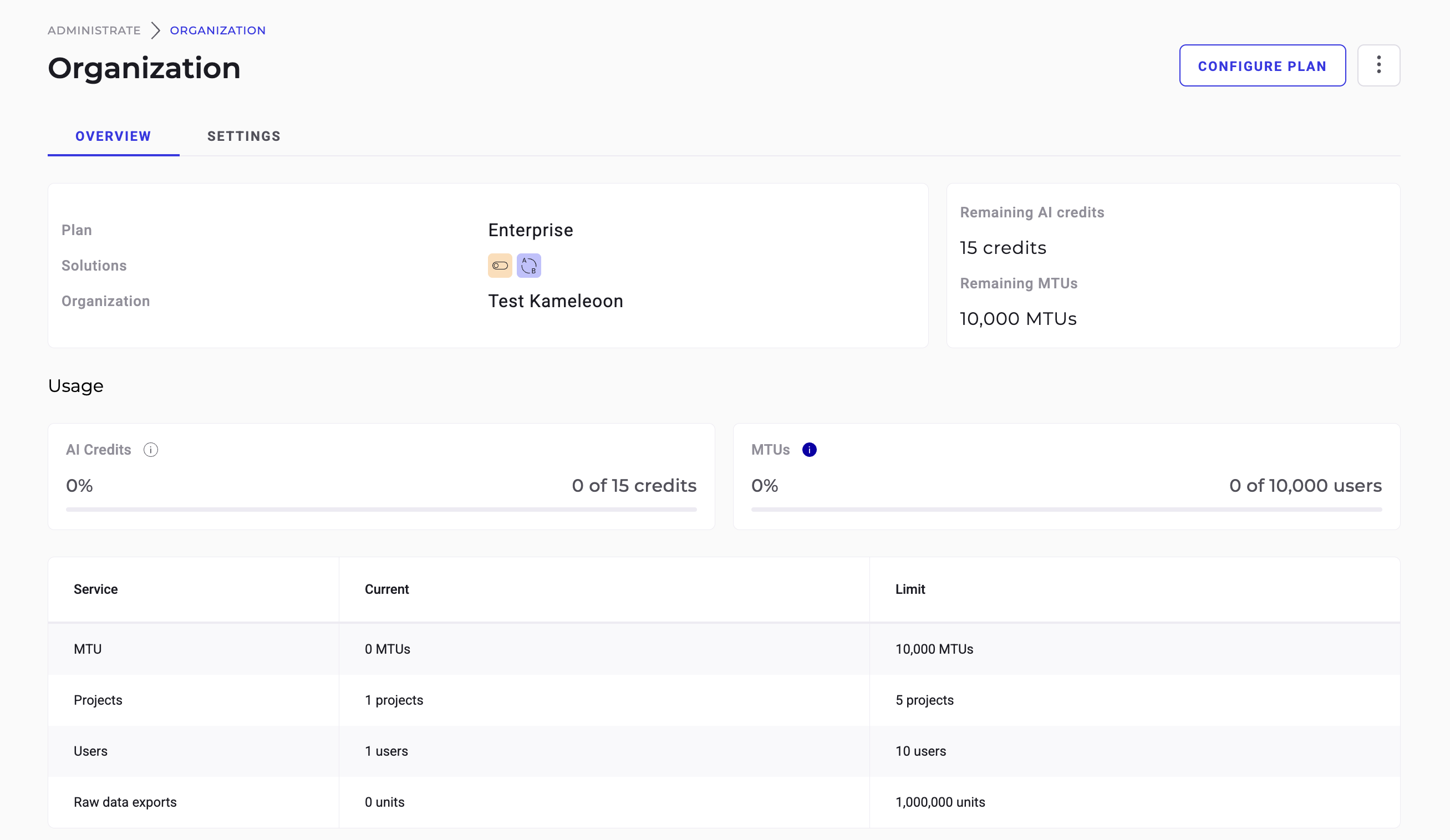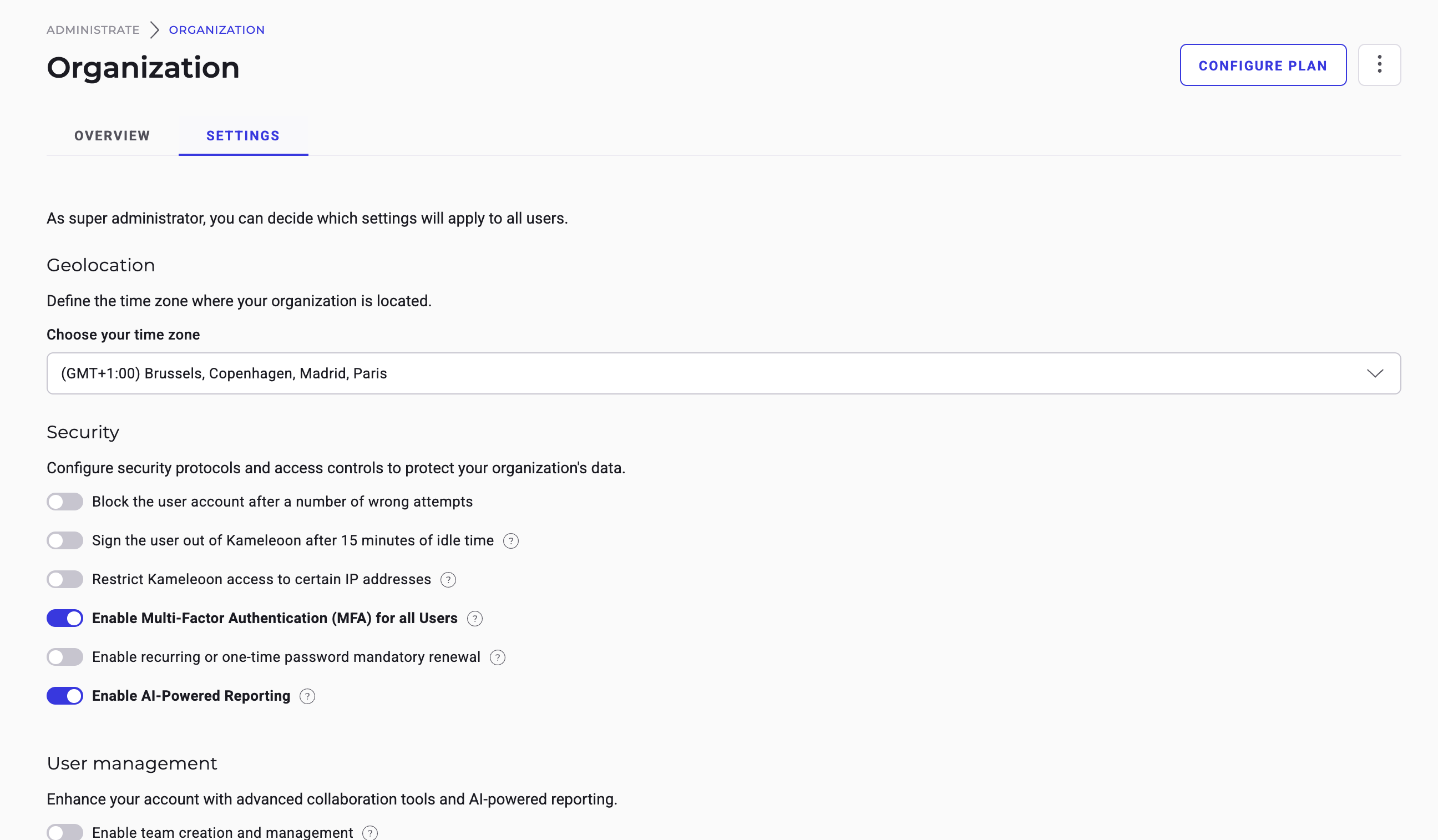 The Organization page lets you view and manage key details about your Kameleoon account, including your plan, usage, and settings that apply to all users in your organization.