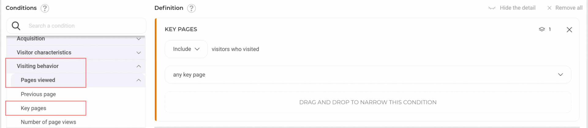 - Select the key page in the dropdown menu and include or exclude visitors meeting the key page's criteria.