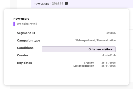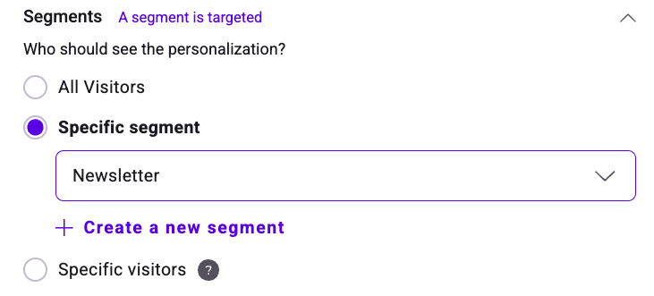 To associate a segment, you can also select Target specific visitors in the Targeting step. Select the segment and connectors you need. Using this option allows you to create quickly targeting conditions without re-creating a segment.