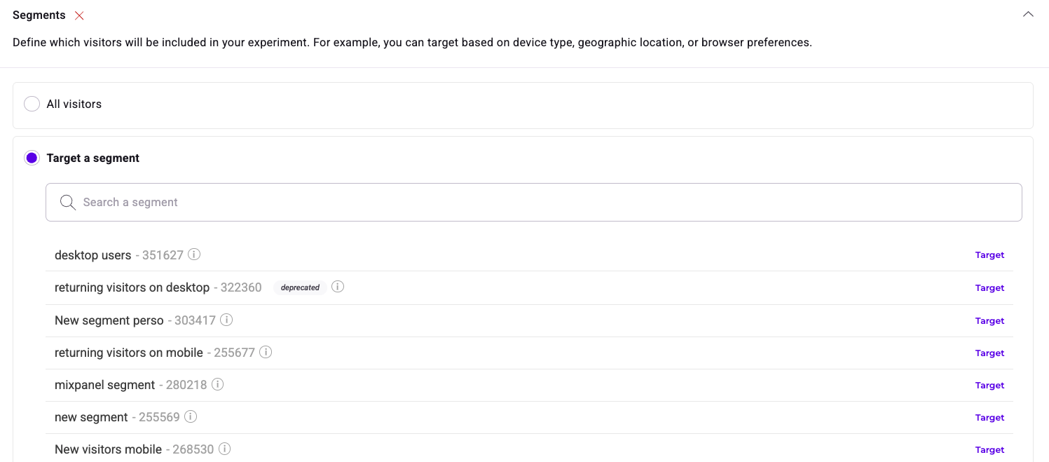 In the Targeting step, click Target a segment in the Segments panel. Then, click the segment you want to target.