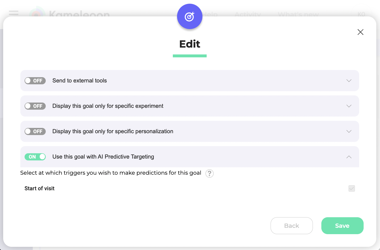 When you create a goal in Kameleoon (for example, getting your visitors to add a product to their cart), you can decide whether you want to enable predictive targeting.