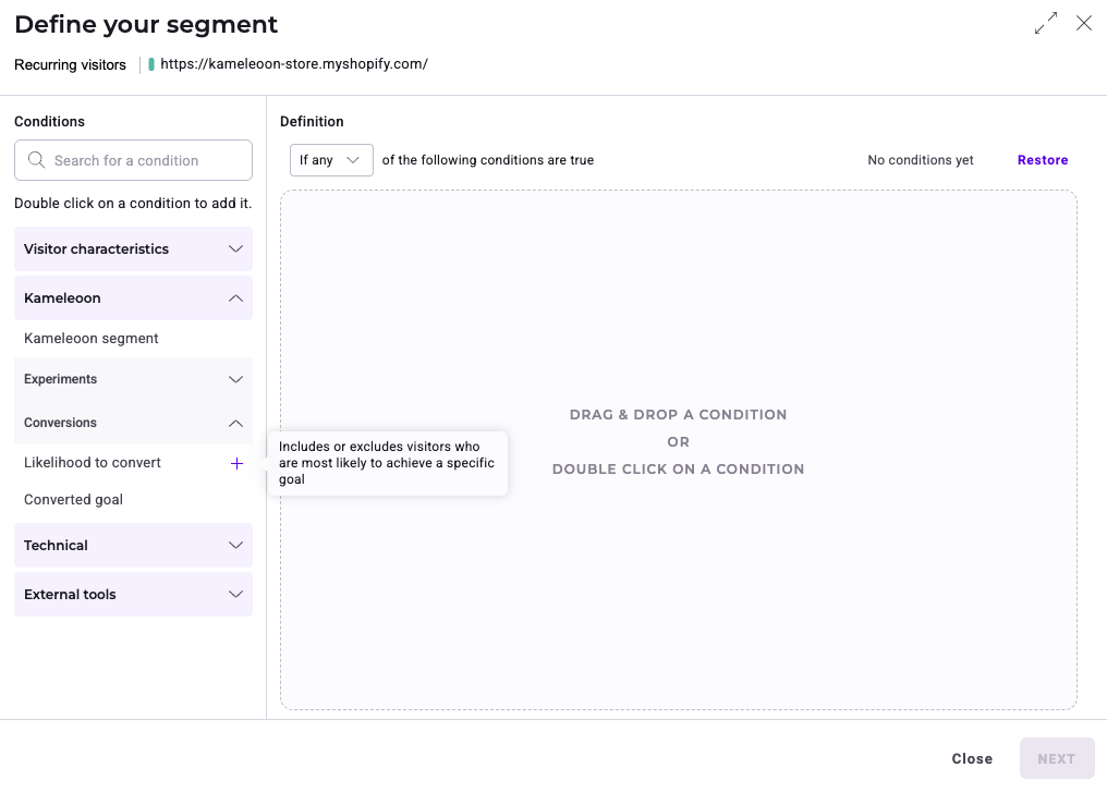 Kameleoon’s AI can then calculate conversion propensity scores for your goal based on these triggers, allowing you to use predictive targeting conditions when setting up personalization targeting. You can find more information on this here, here, and here.