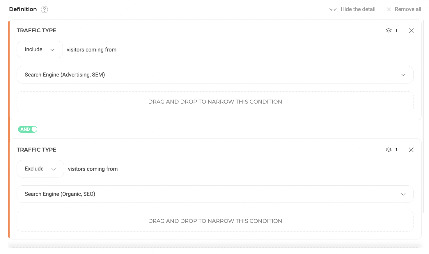 - Traffic type: Includes or excludes visitors from specific sources (for example, search engine, emailing, website tributary).