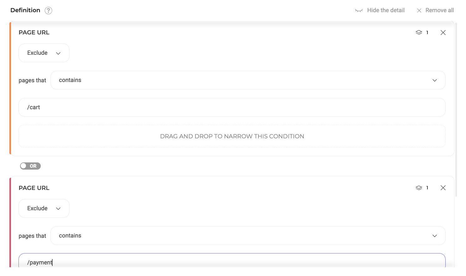 - Condition 3: URL contains /payment (Exclude, True)