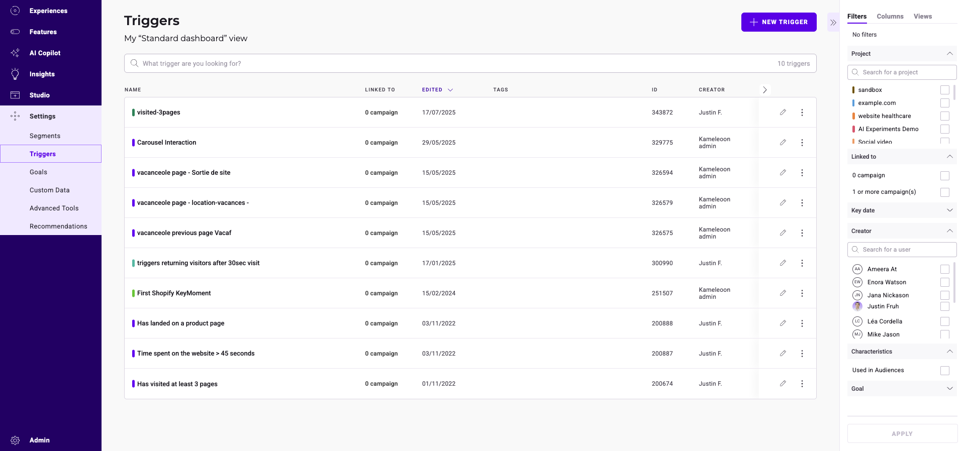 You can display triggers used in Audiences or with AI Predictive targeting. Check the filter and click Apply.