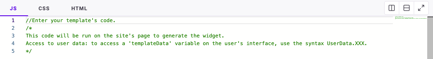 Use the central content area to code your widget template. This code generates the widget on your website's page. The editor provides three tabs for different code types: