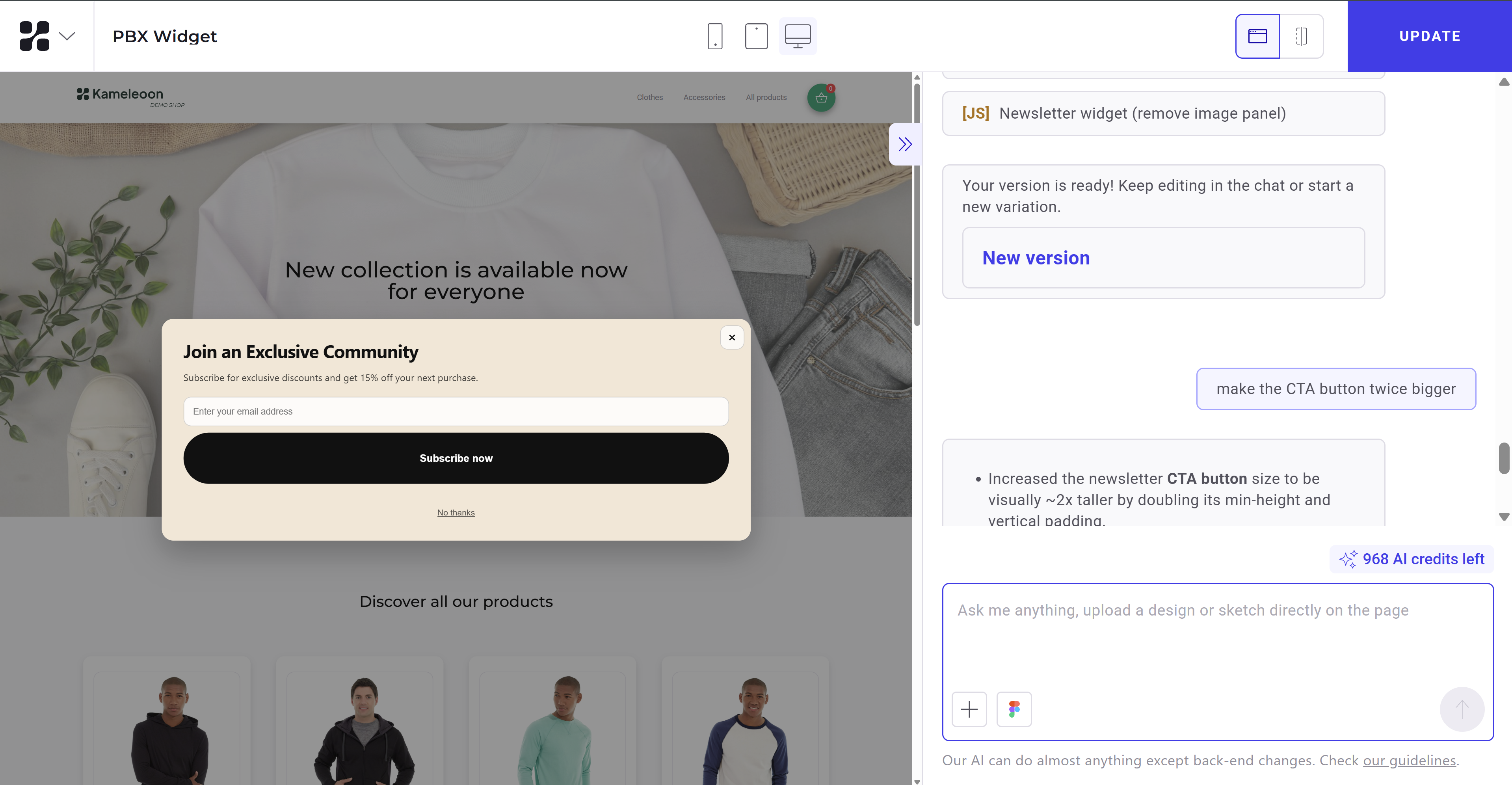 PBX Widgets is an AI-powered UI generator that helps you create widgets for your experiments and personalizations created in the new personalization builder. Instead of manually writing HTML, CSS, and JavaScript, you describe the widget in natural language, and PBX generates the component automatically.