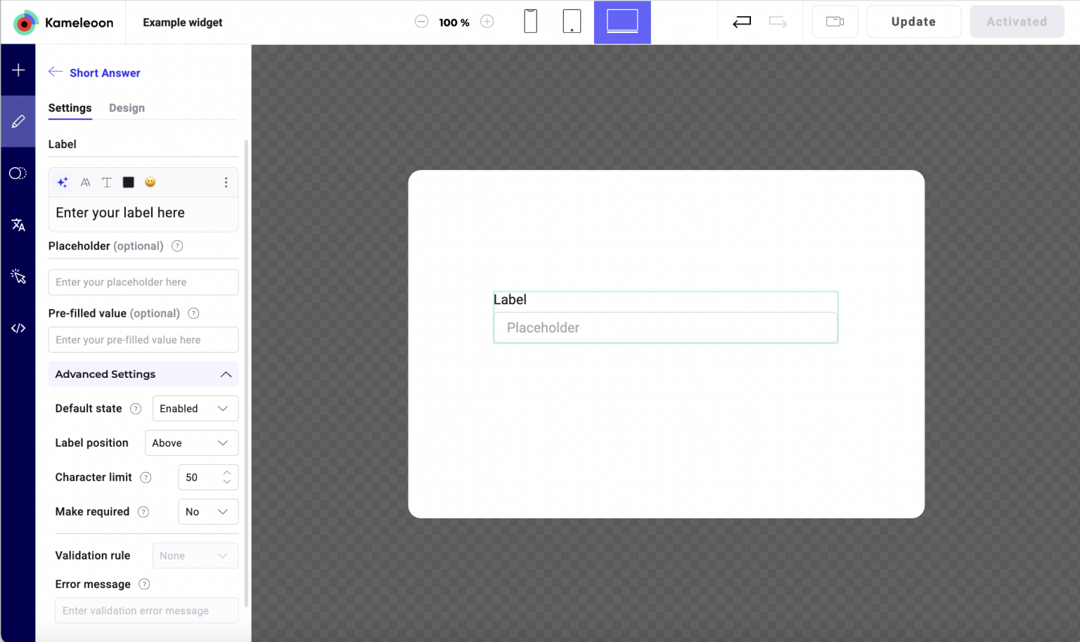 - Error message: Custom message shown when validation fails. The style of the error message can be configured in Design > Answers by selecting the Invalid state.