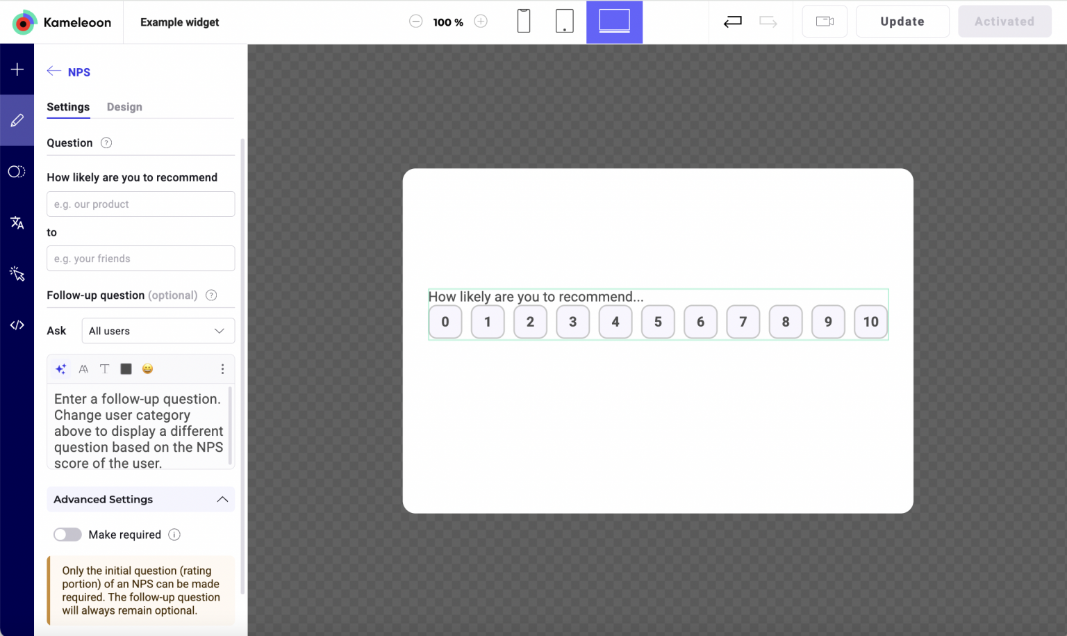 - Make required: Only the initial NPS score can be marked as required. The follow-up question is always options.