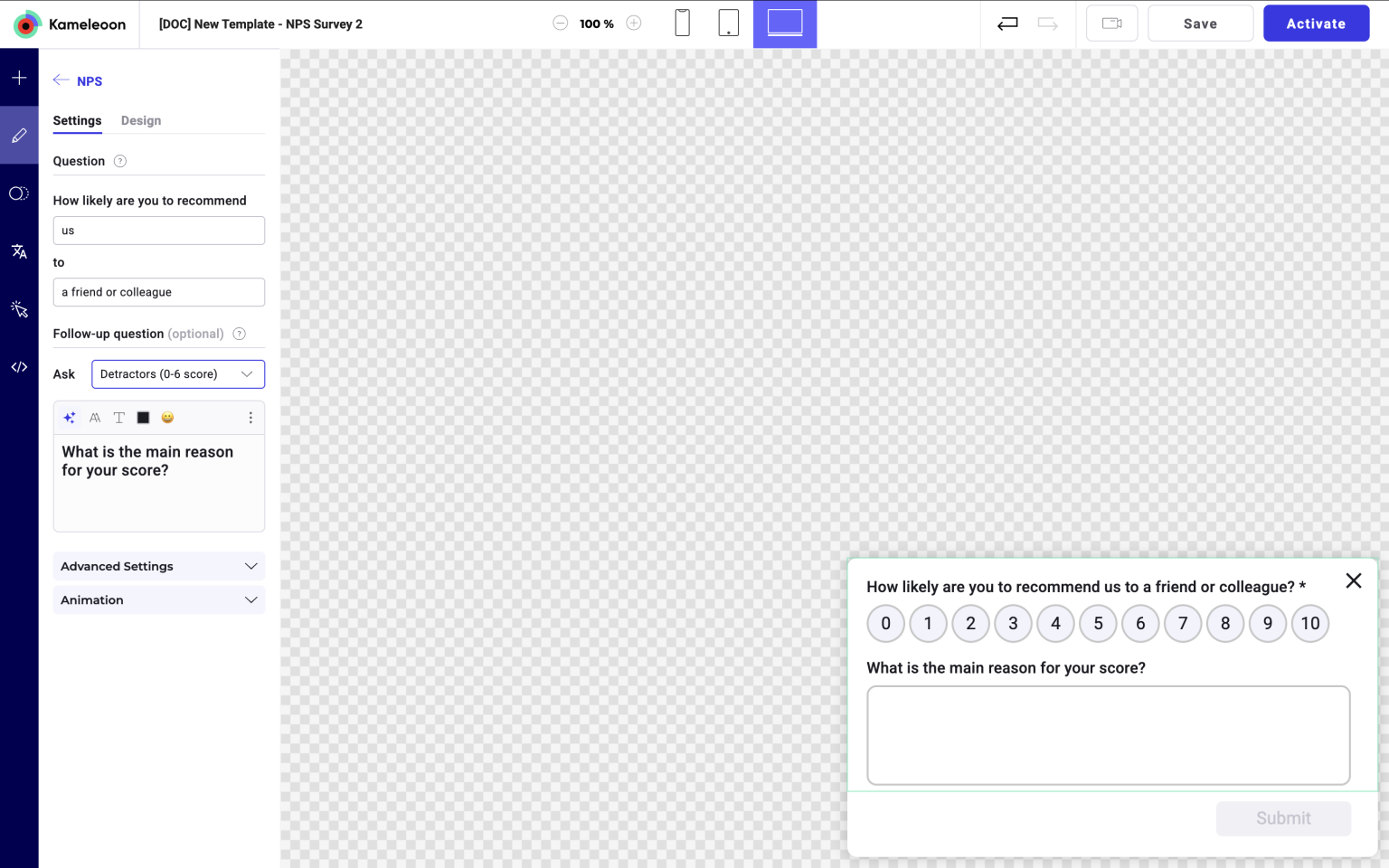 - In the Settings tab, under Follow-up question, select Detractors