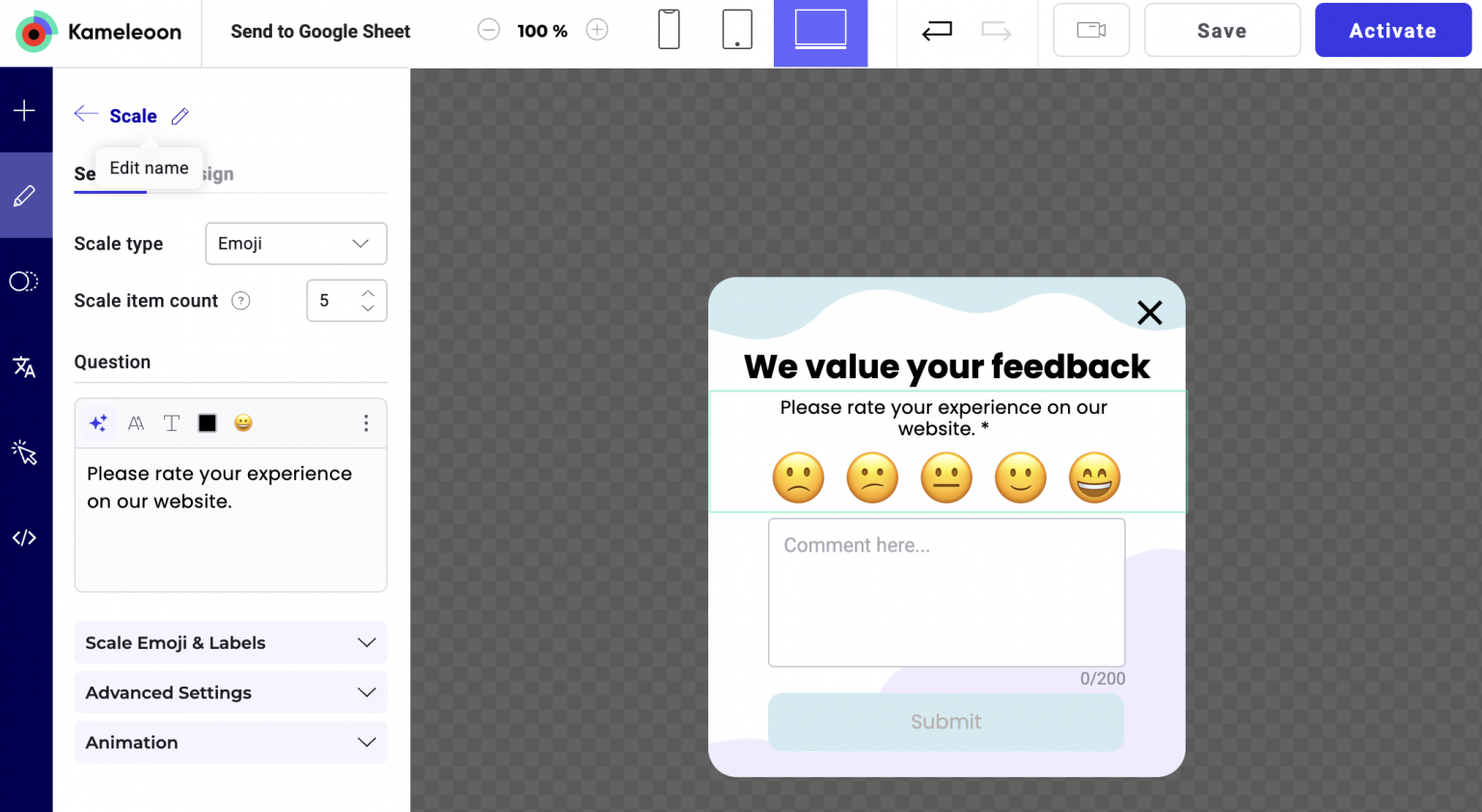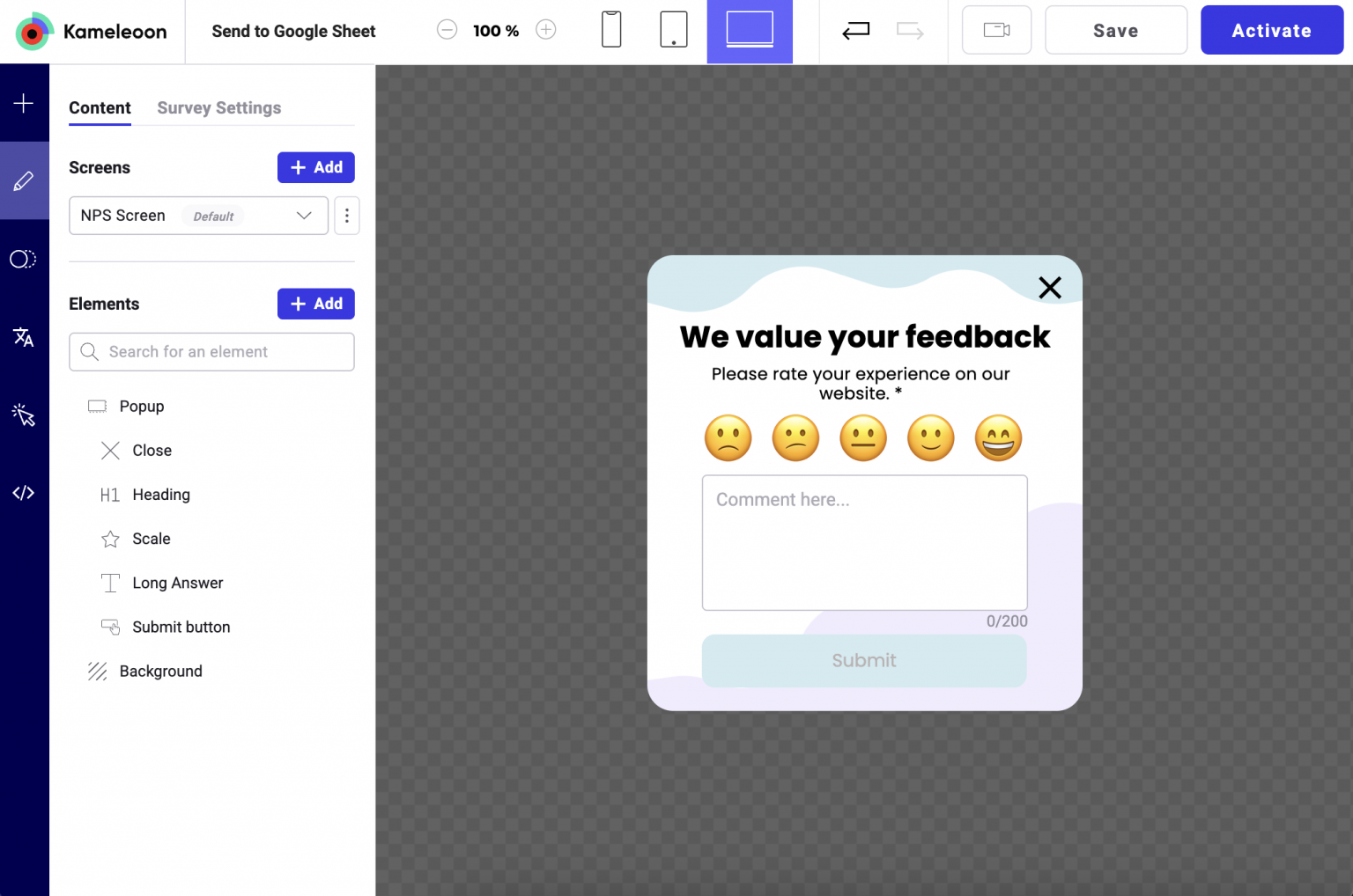 - How to set up the Survey Settings tab in the Widget Studio to send responses to Google Sheets.