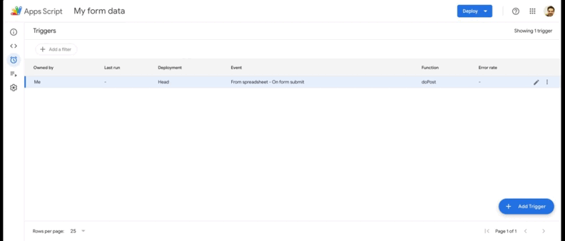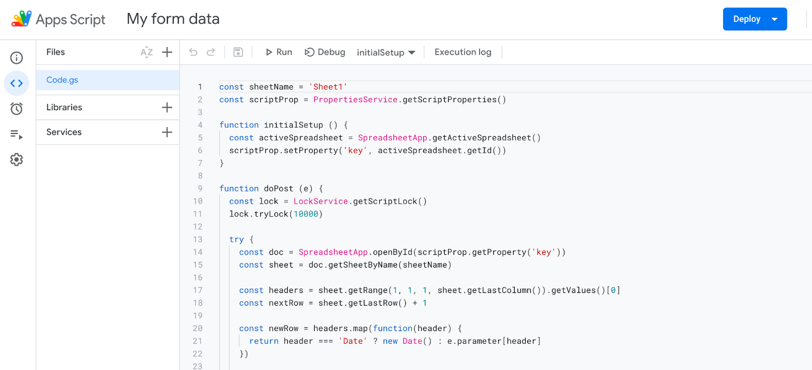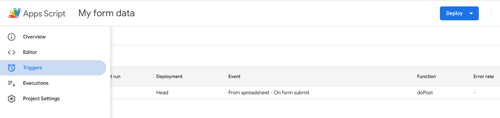 - Click Extensions > App Script. A new Google Script opens. Rename it (for example, My form data).