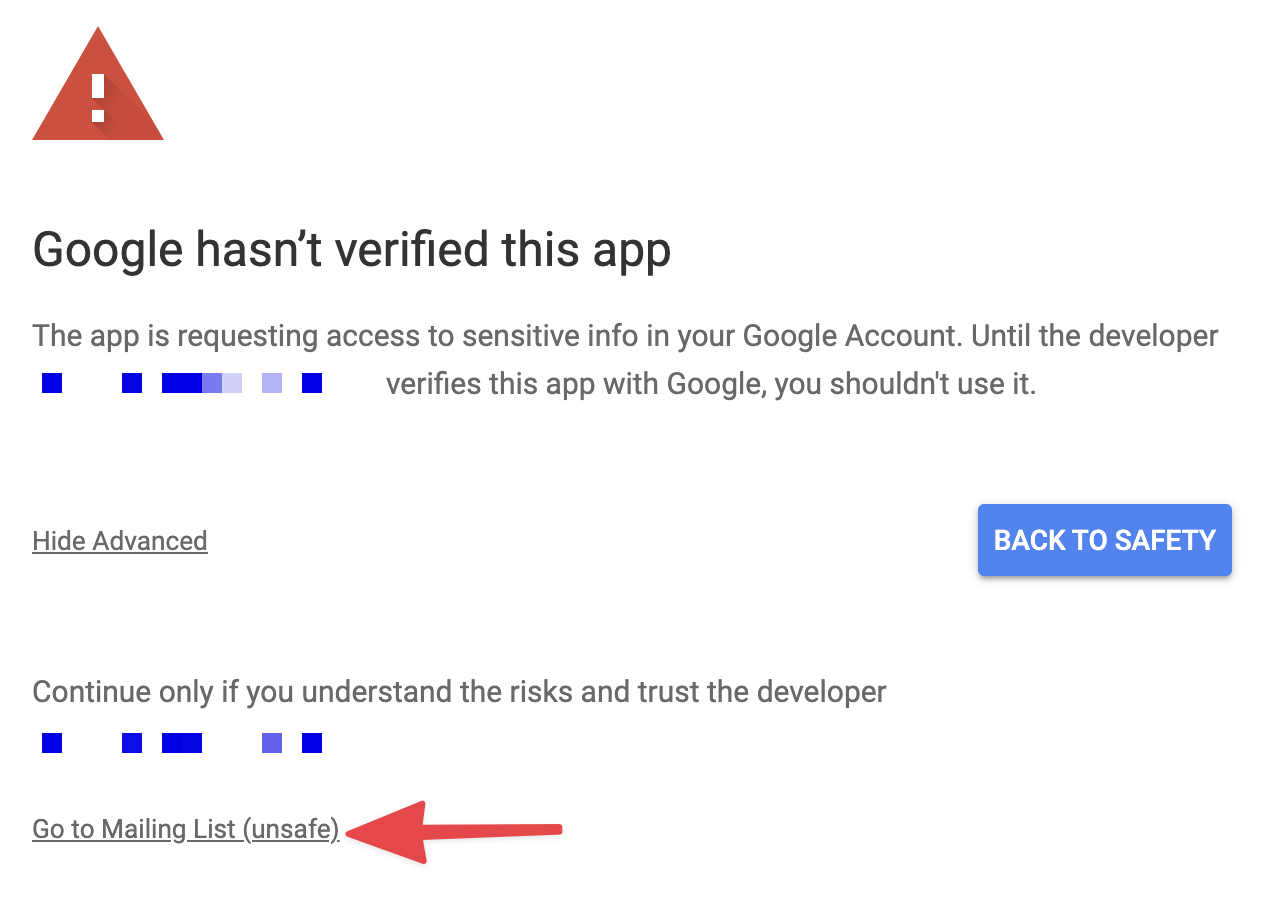 Because Google has not reviewed the script, a warning message may appear. Click Go to Mailing List (unsafe) to set up the correct permissions to update your form.