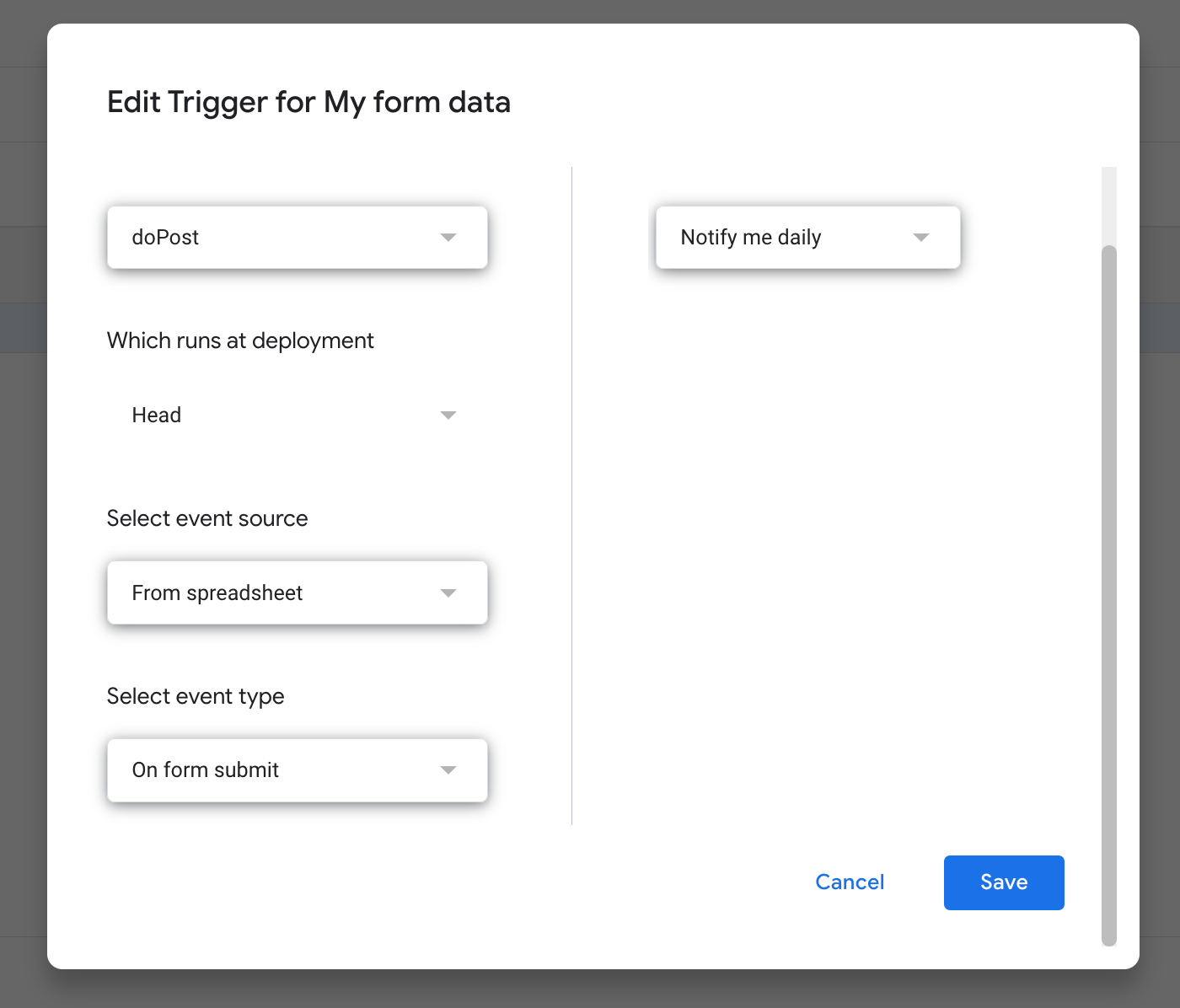 POST. - Action URL: Paste the URL generated by your Google Apps Script.
