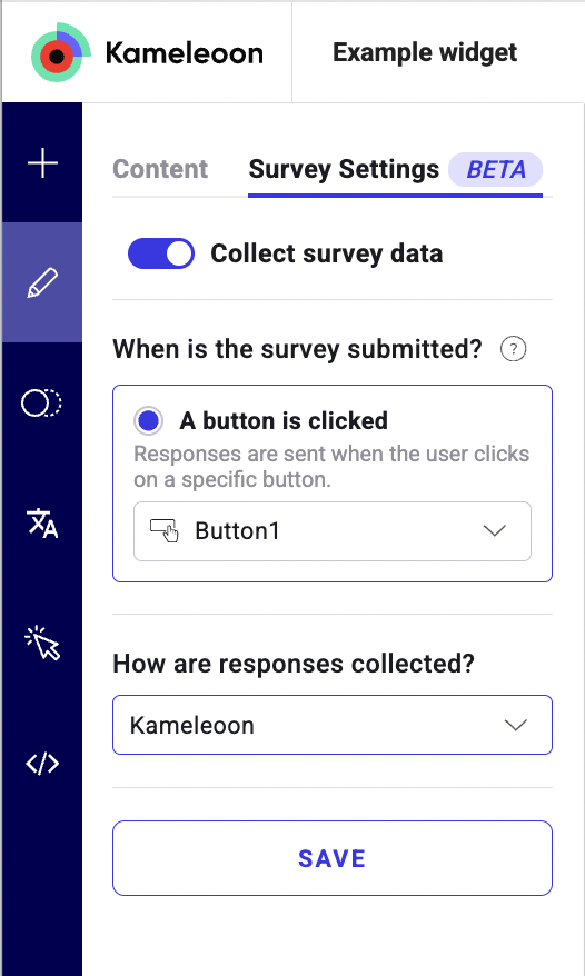 In addition to customizing individual survey elements, Kameleoon provides global settings that define how your survey behaves and how responses are handled. The Survey Settings tab appears automatically in the Widget Studio when at least one survey element is added to your widget. Survey Settings lets you configure how and when survey responses are submitted, and where they are collected.