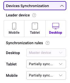 When you open this section, there is a Leader device label with three clickable icons: mobile, tablet, and desktop. By default, the leader device selected is desktop, but you can select another leader device. The settings applied on a leader device will be replicated on all other devices that are fully or partially synchronized with it.