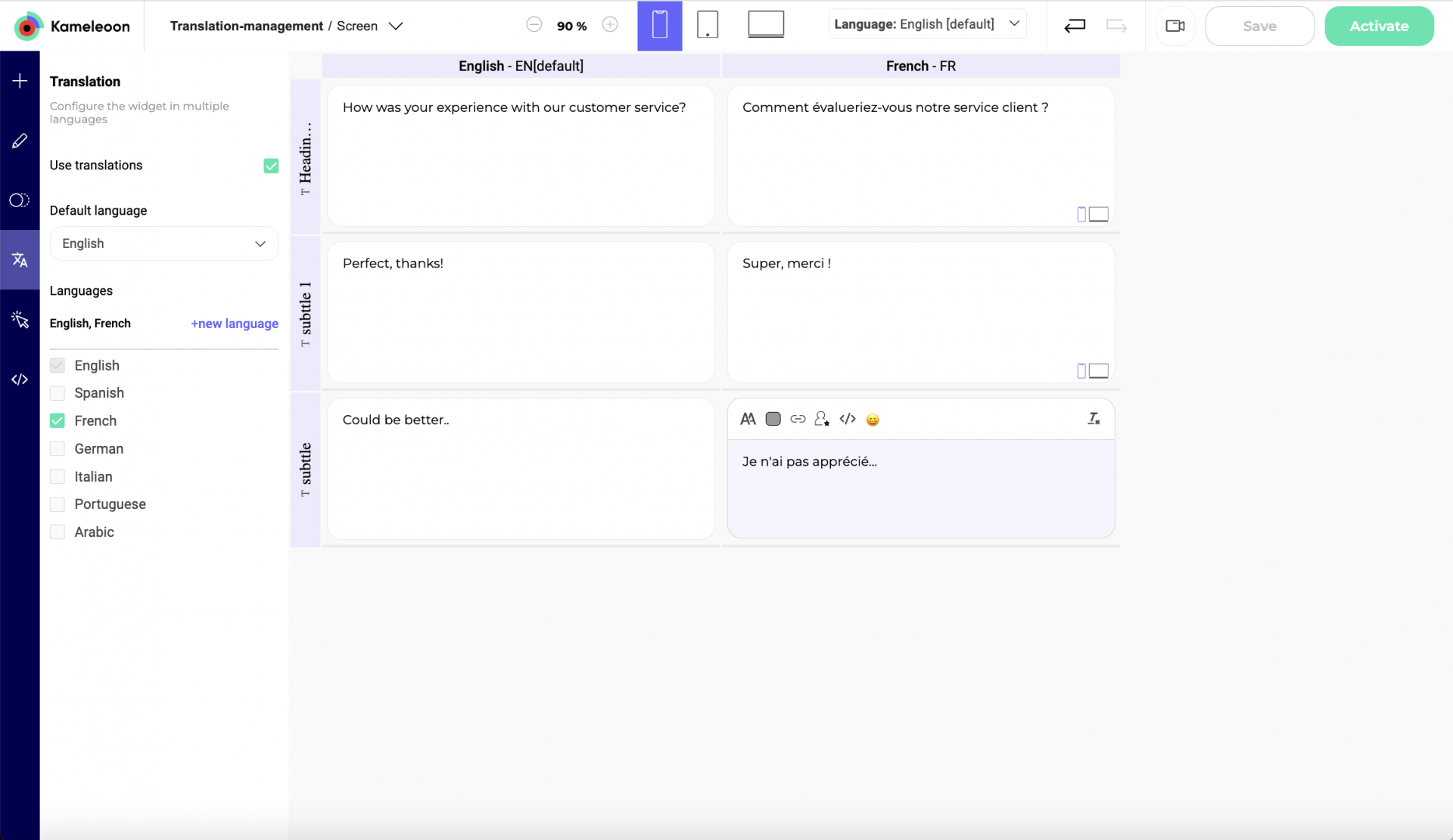 In the main panel on the right, you will find tabs for each language you've activated. Each tab contains editable fields with the source text on the left and space for the translated text on the right.