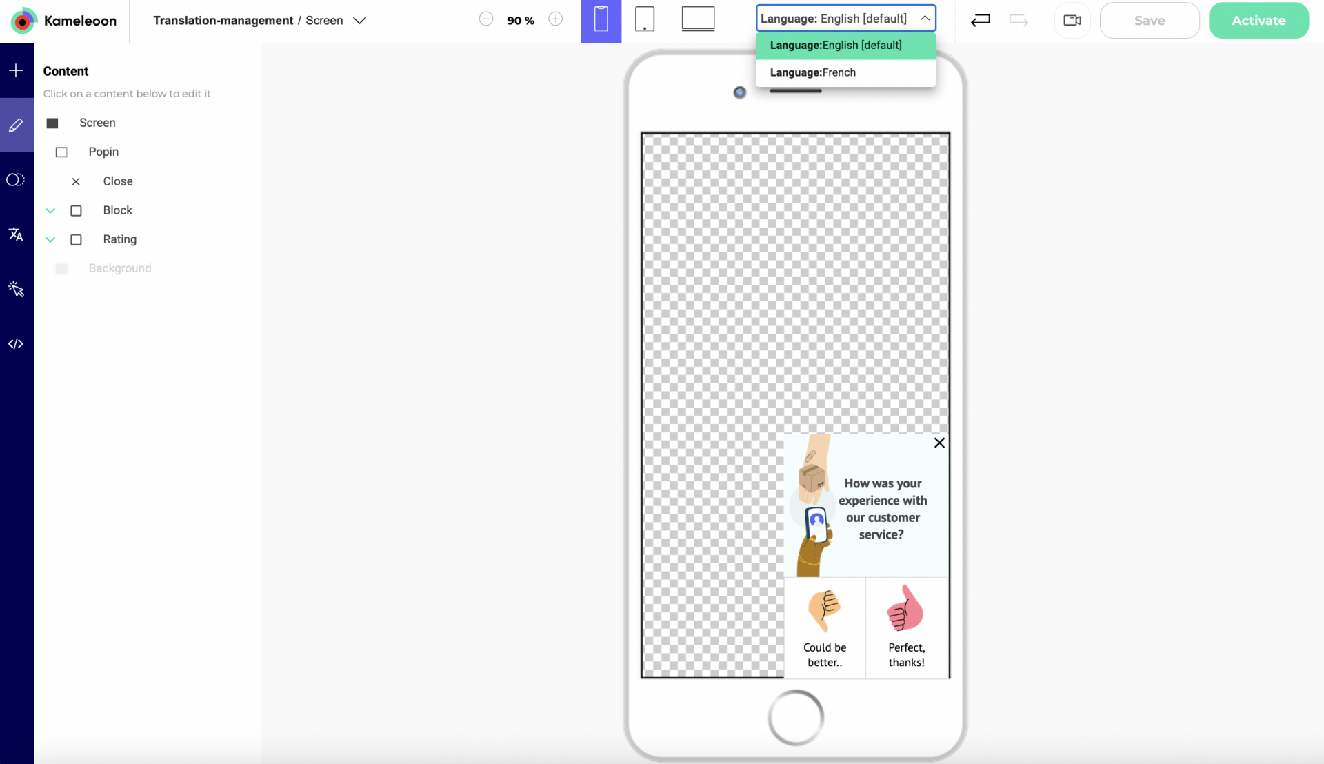 Go to the Design section of the Widget Studio. At the top, you can switch languages.