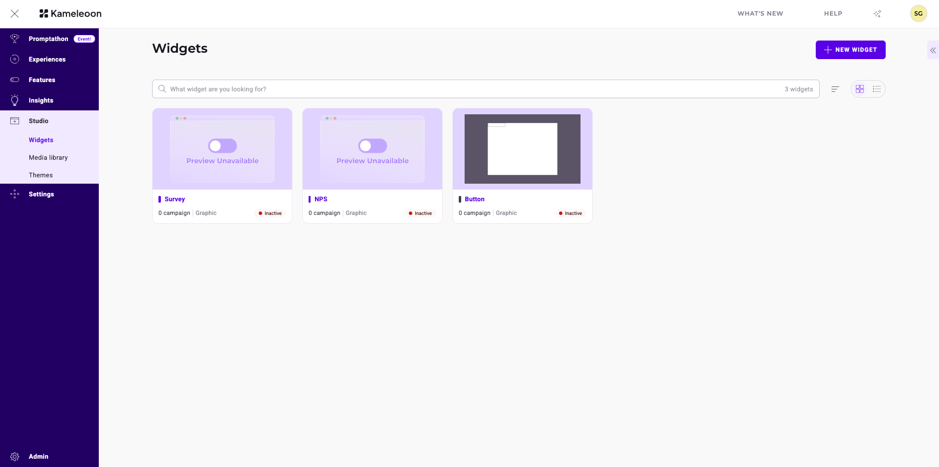 To access the Widgets dashboard, click Studio > Widgets.
