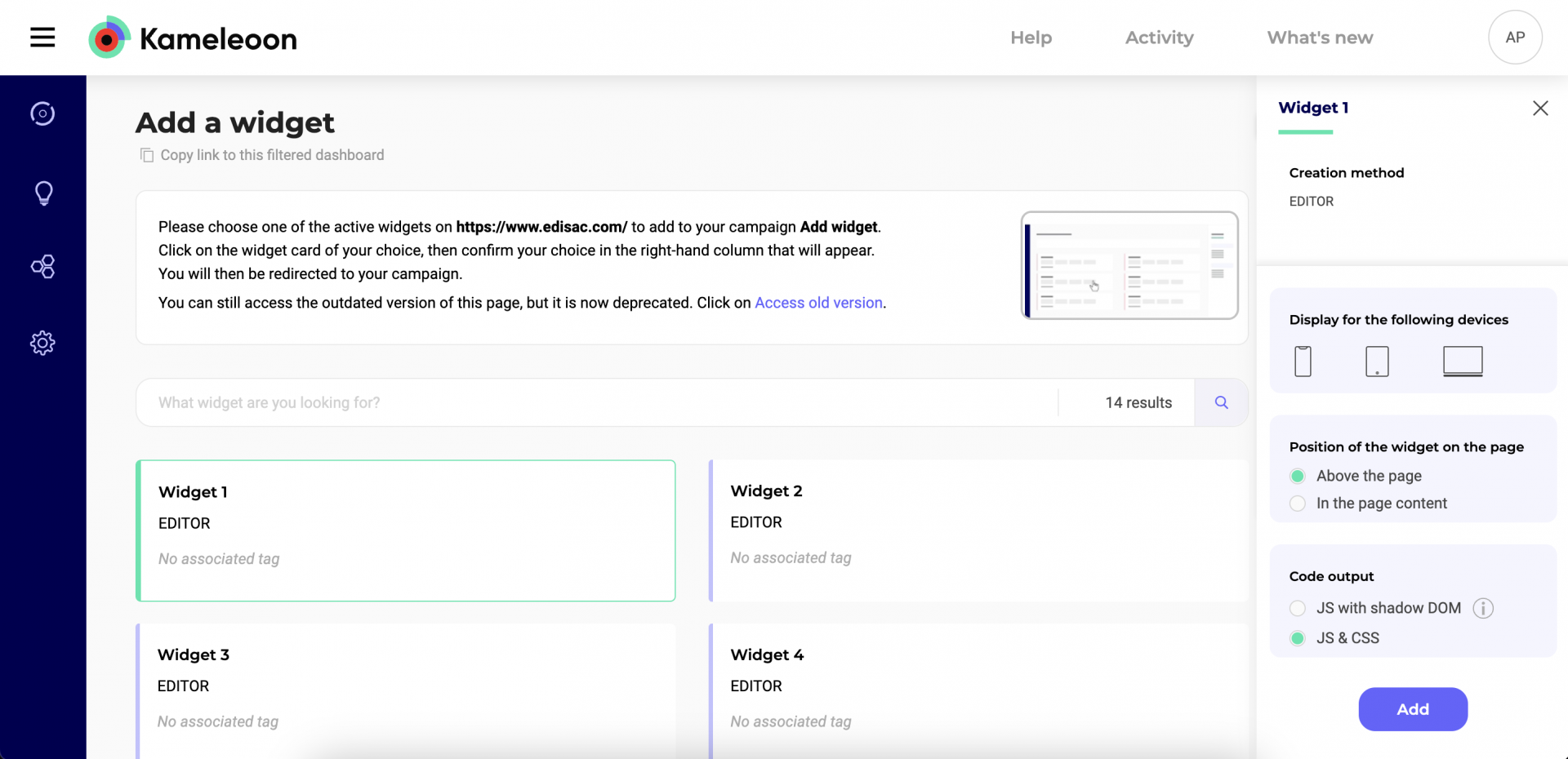 - Select the output for the widget's code (JS with shadow DOM or JS and CSS).