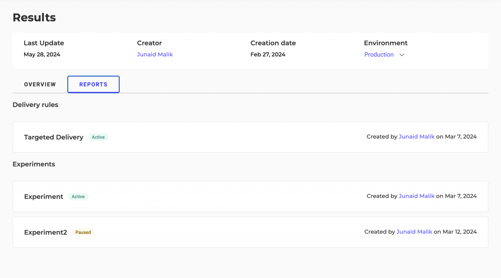 - Reports: Shows a list of the feature delivery and experiment rules you've created. Click any to view in-depth reporting. To access reports for your rules, you must assign at least one goal to your feature.