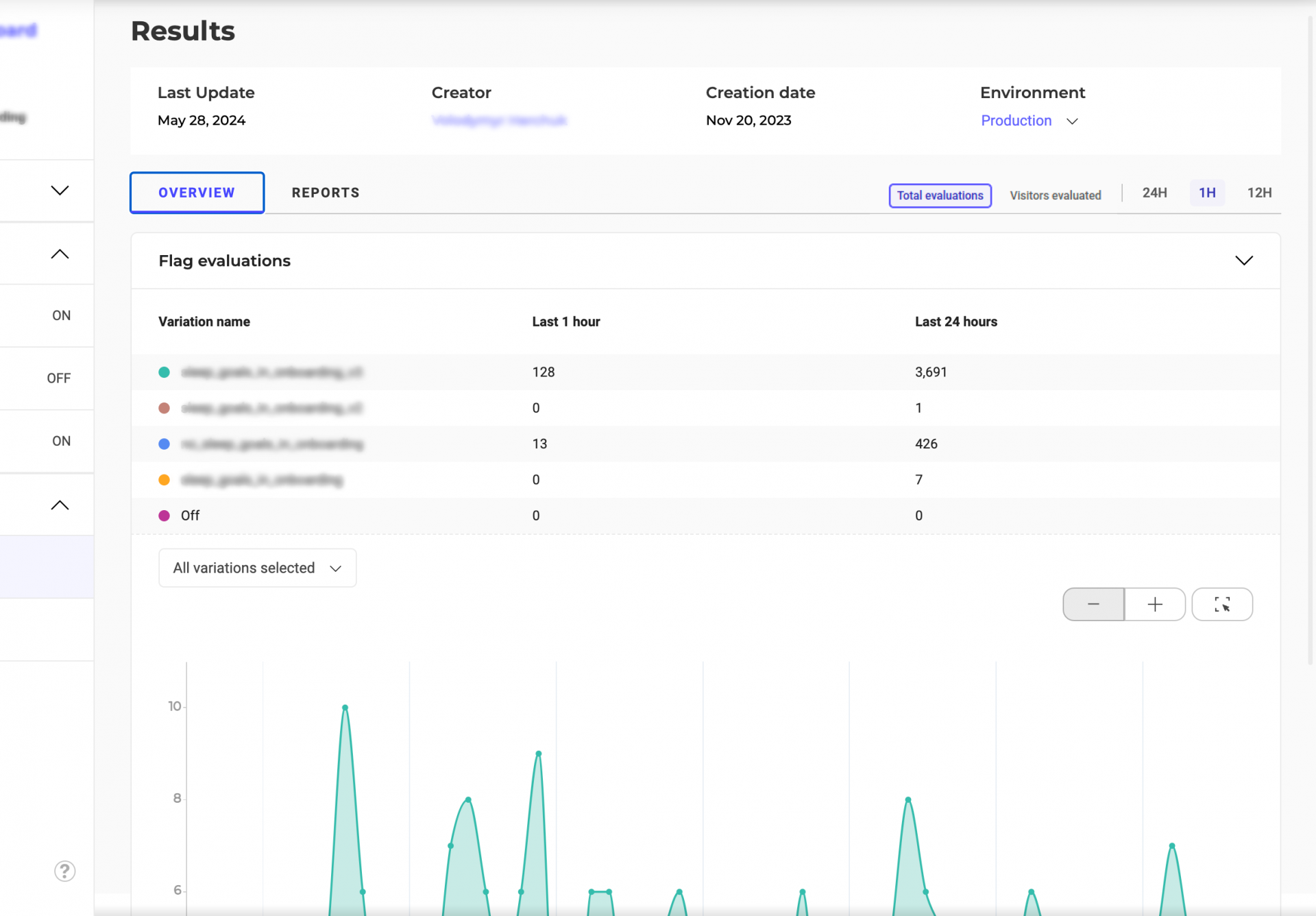 - Overview: This view shows reporting data from the last 24 hours. You can choose from a variety of time intervals (1, 12, and 24 hours), and filter by Total Evaluations or Visitors Evaluated.