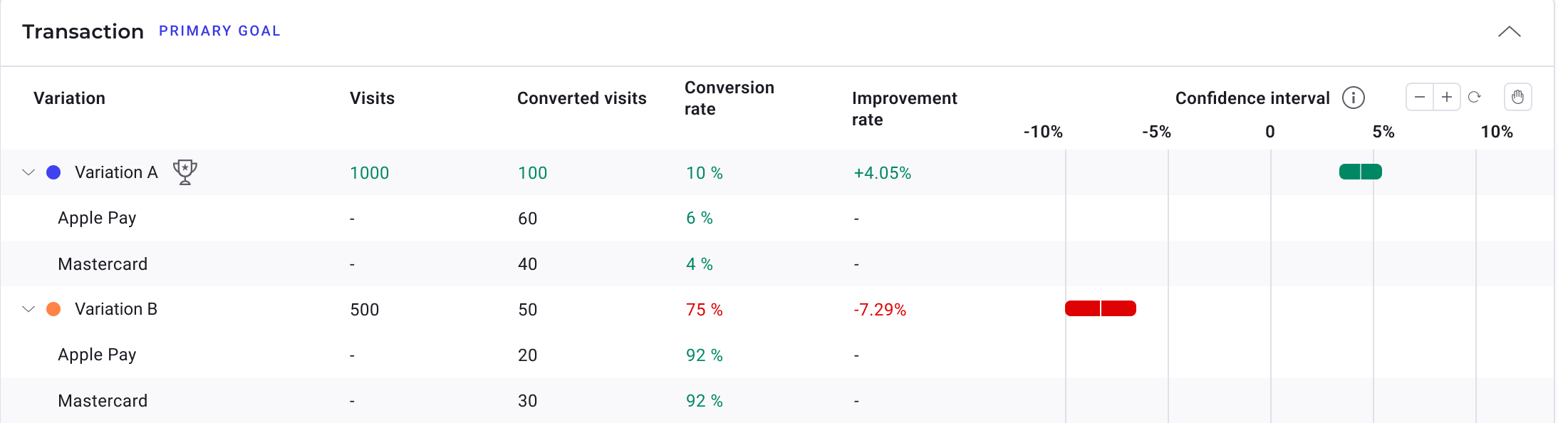 By filtering and breaking down conversions with goal metadata, you can isolate the impact of specific variables and gain a more detailed view of your experiment's performance. The breakdown shows the improvement rate calculated only from visits where the selected metadata exists, rather than from all visits.