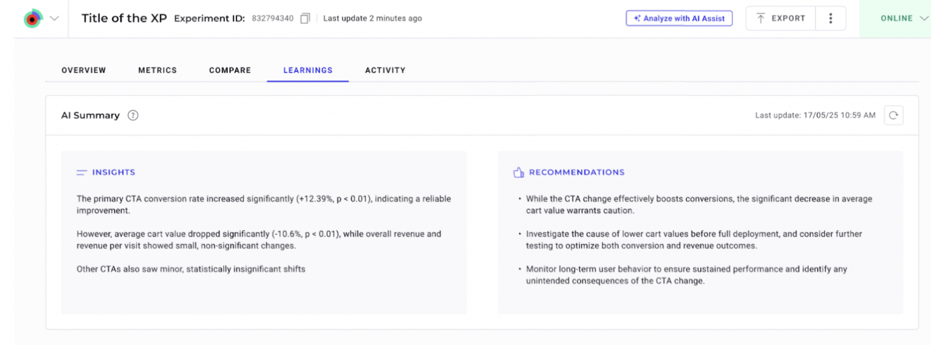 The Learnings tab provides a summary of your experiment results, generated by Kameleoon’s AI (KAI).