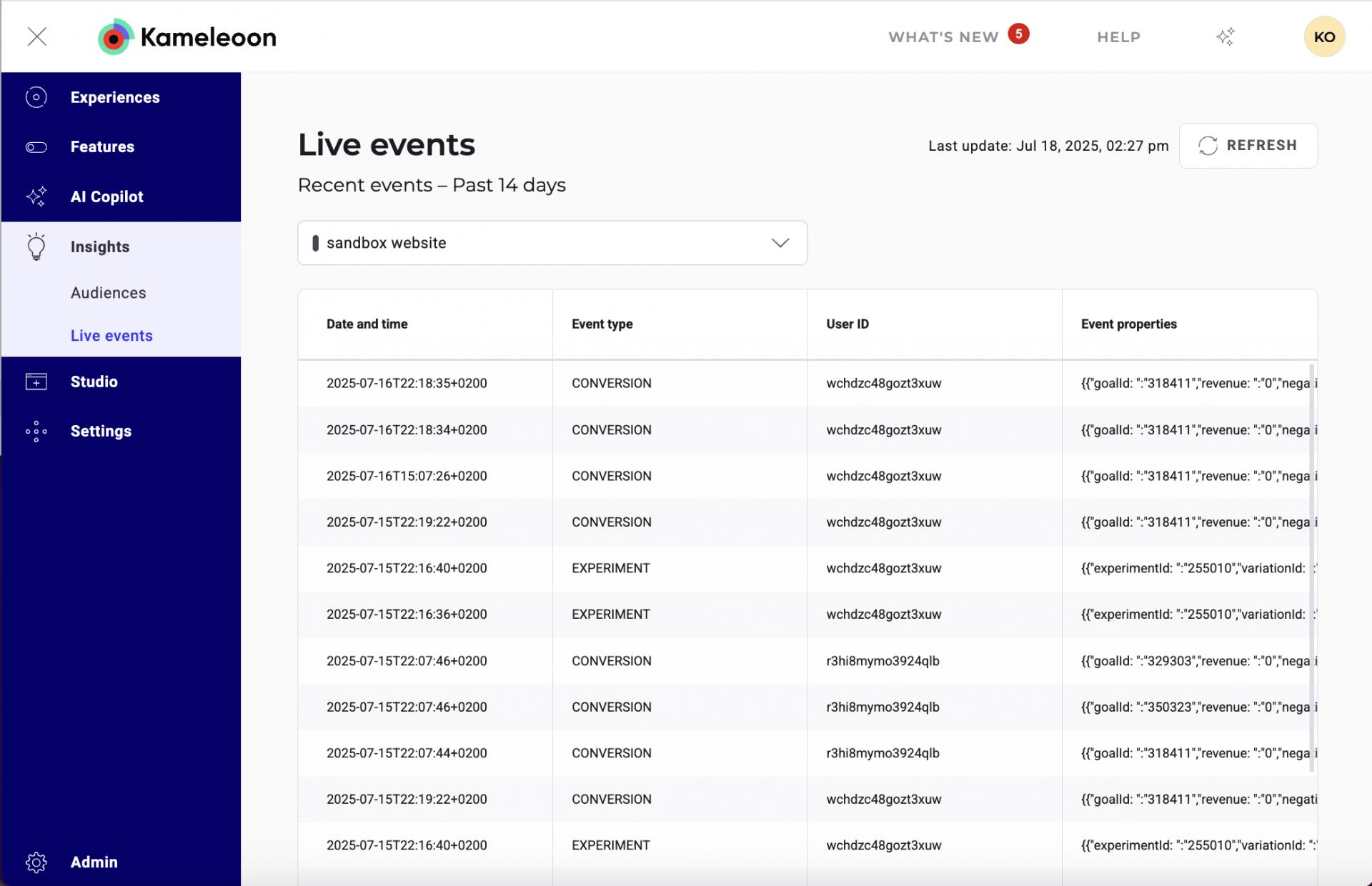 The Live Events page lets you monitor and inspect incoming user events on your website in real time (over a rolling 14-day window). Whether you’re troubleshooting experiment exposures or verifying conversions, this tool gives you instant visibility into what’s happening in your A/B testing setup.