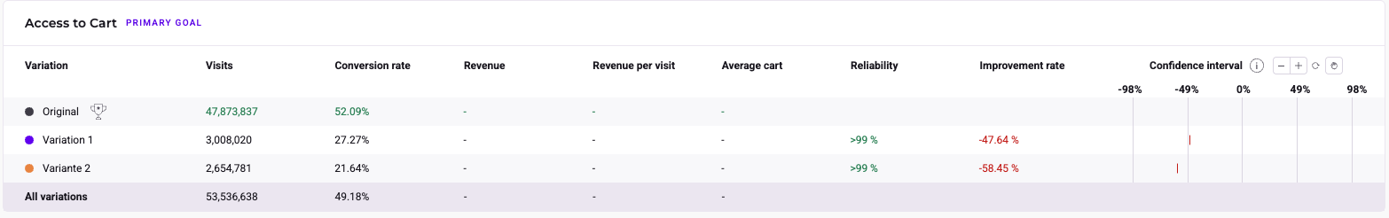 However, you can draw conclusions for your website from a reliability rate stabilized at 75%. If the traffic on the page is not sufficient, your reliability rate will probably not reach 95%. But the Kameleoon results page offers a wide variety of data and indicators that will help you understand your audience.