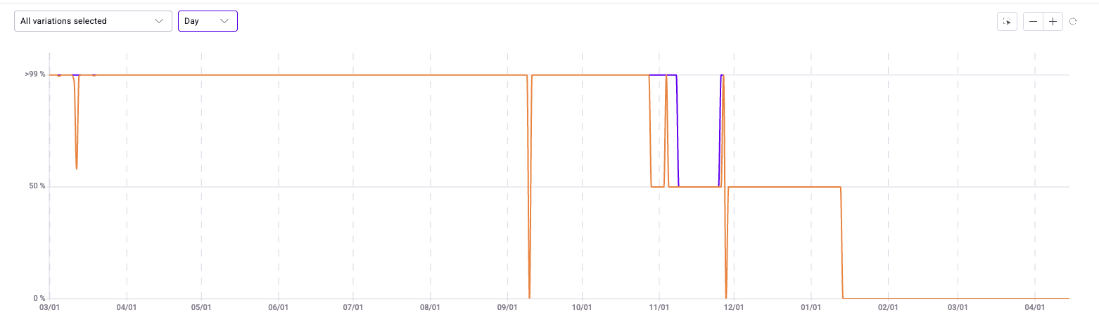 You can select which variations are displayed using the dropdown menu (all variations are selected by default). You can also choose to view data by Day, Week, or Month. Hover over the chart to view more reliability rate data.