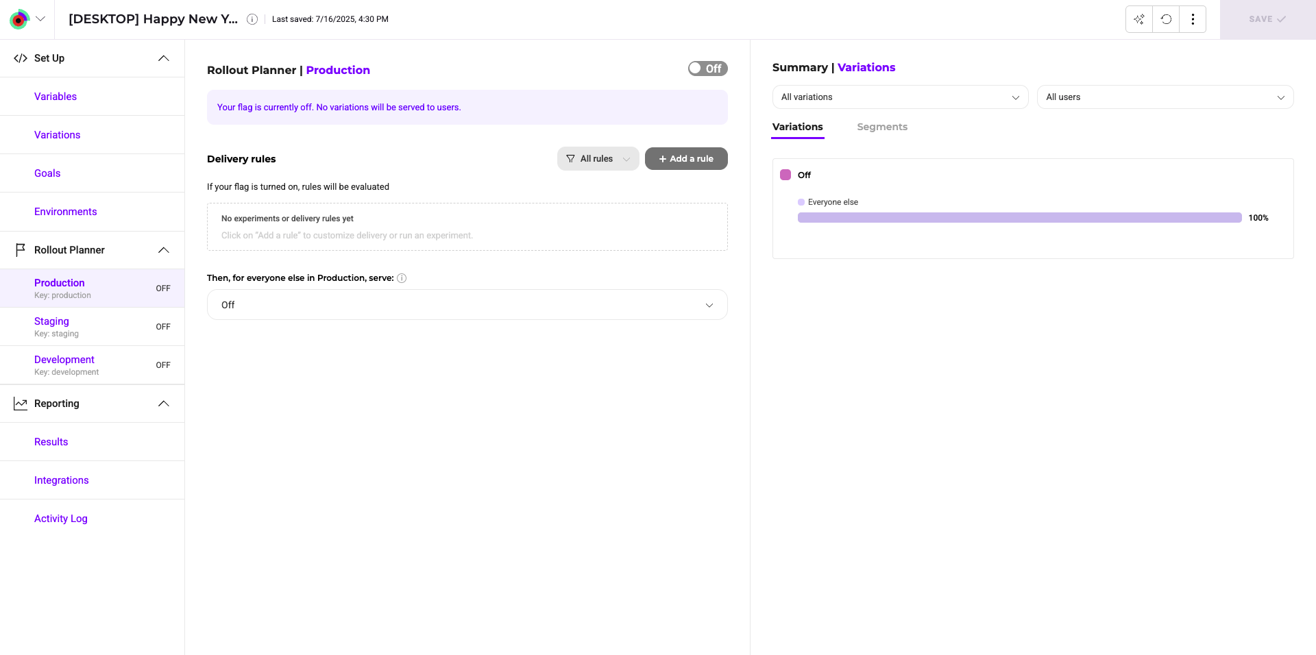 - A Rollout Planner specific to each environment. Changes made to a feature flag are specific to the environment you have selected in this section. Kameleoon lets you link your production and staging/QA environments to the app.