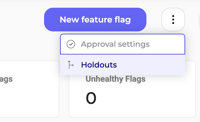 To get started, go to the Feature Experimentation dashboard and click the three dots menu in the top-right corner > Holdouts. The Holdouts panel will open.