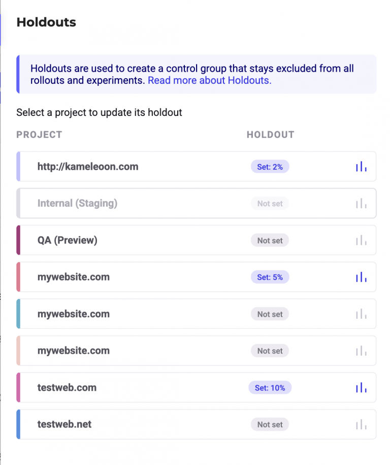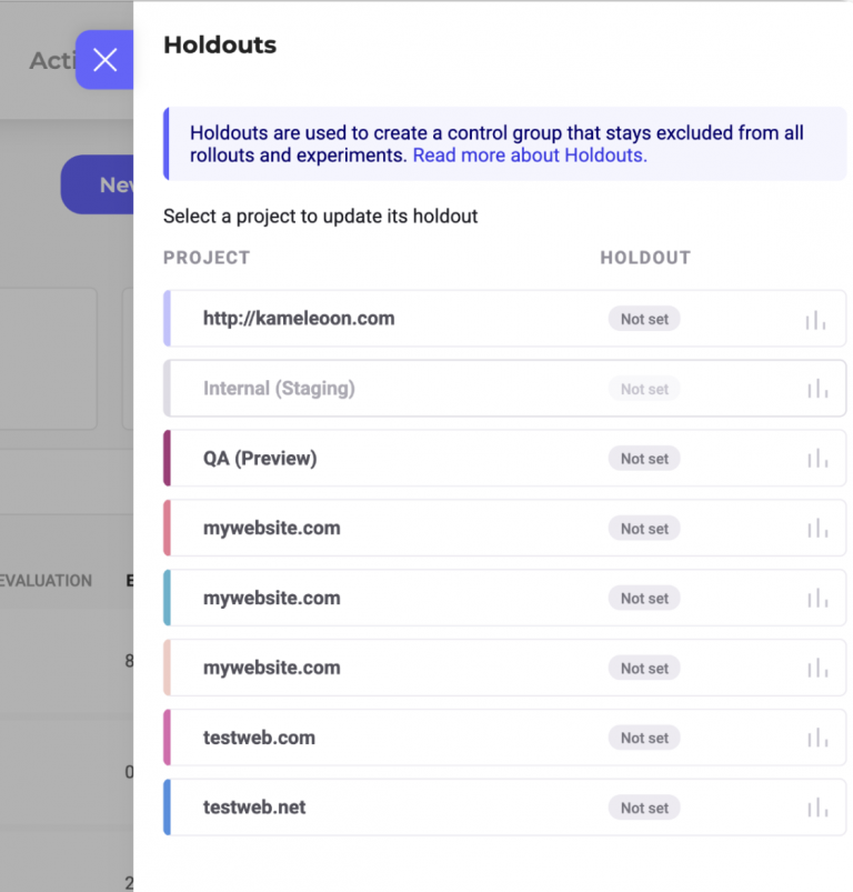 In the panel, you'll see a list of your Kameleoon projects, each with a summary of its holdout status. By default, all projects will show Not set under holdout status.