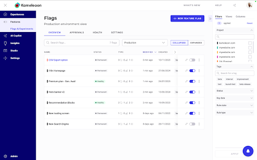 - Health: Displays flag health, last evaluation, and last modification to better manage technical debt.