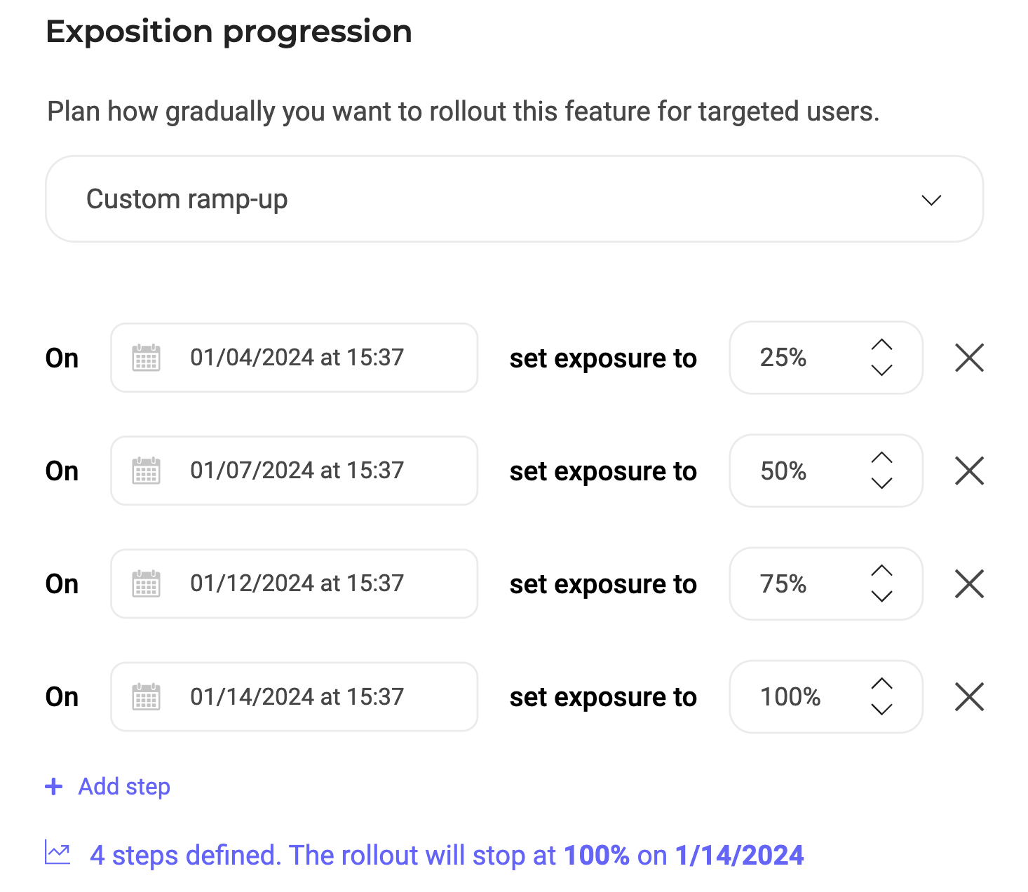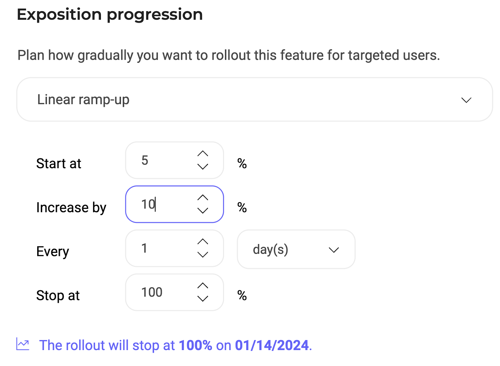 - Final exposure limit: define the percentage at which you want the rollout to stop. Below this section, you will see a confirmation of when and at what exposure percentage the rollout will stop.