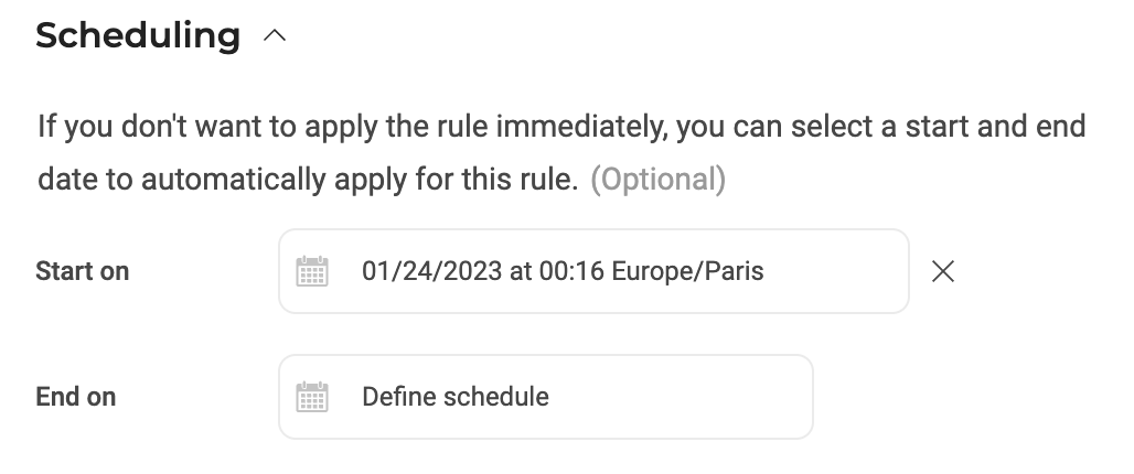 A calendar opens when you select a start or end date. Use the calendar to pick the date and time for the rule to take effect or expire.