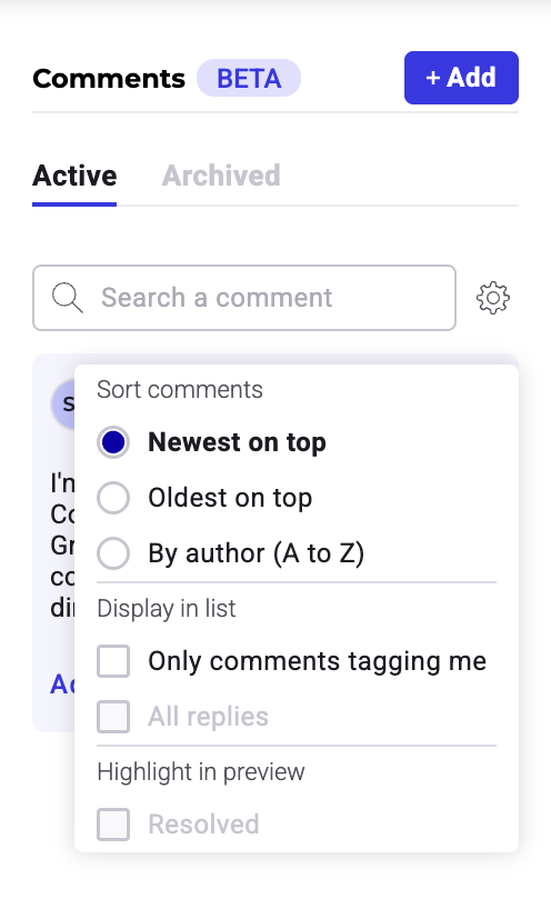 You have access to a variety of settings in the Comments sidebar. Click the cog icon to view the available settings.