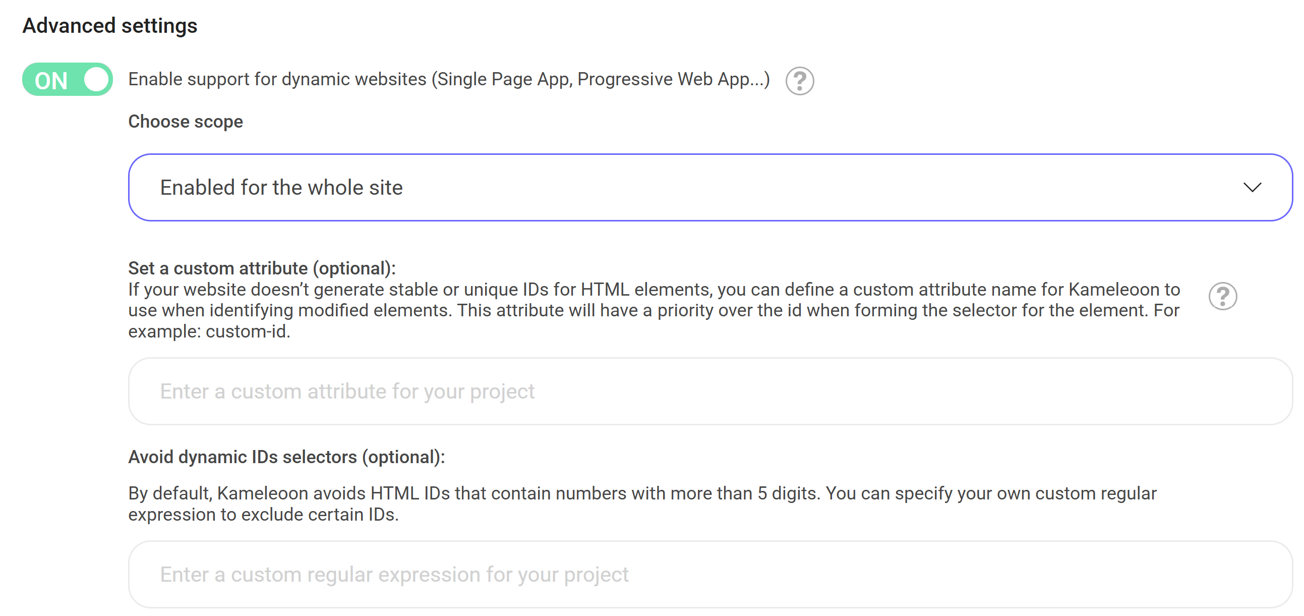 If your website is a full-site SPA, enabling the "support for dynamic websites" option ensures Kameleoon looks for URL changes. When the URL changes, all Kameleoon scripts rerun, including targeting and variation code.