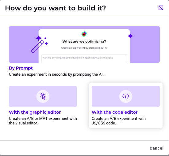 Click New experiment in your Experiments dashboard > With the code editor.