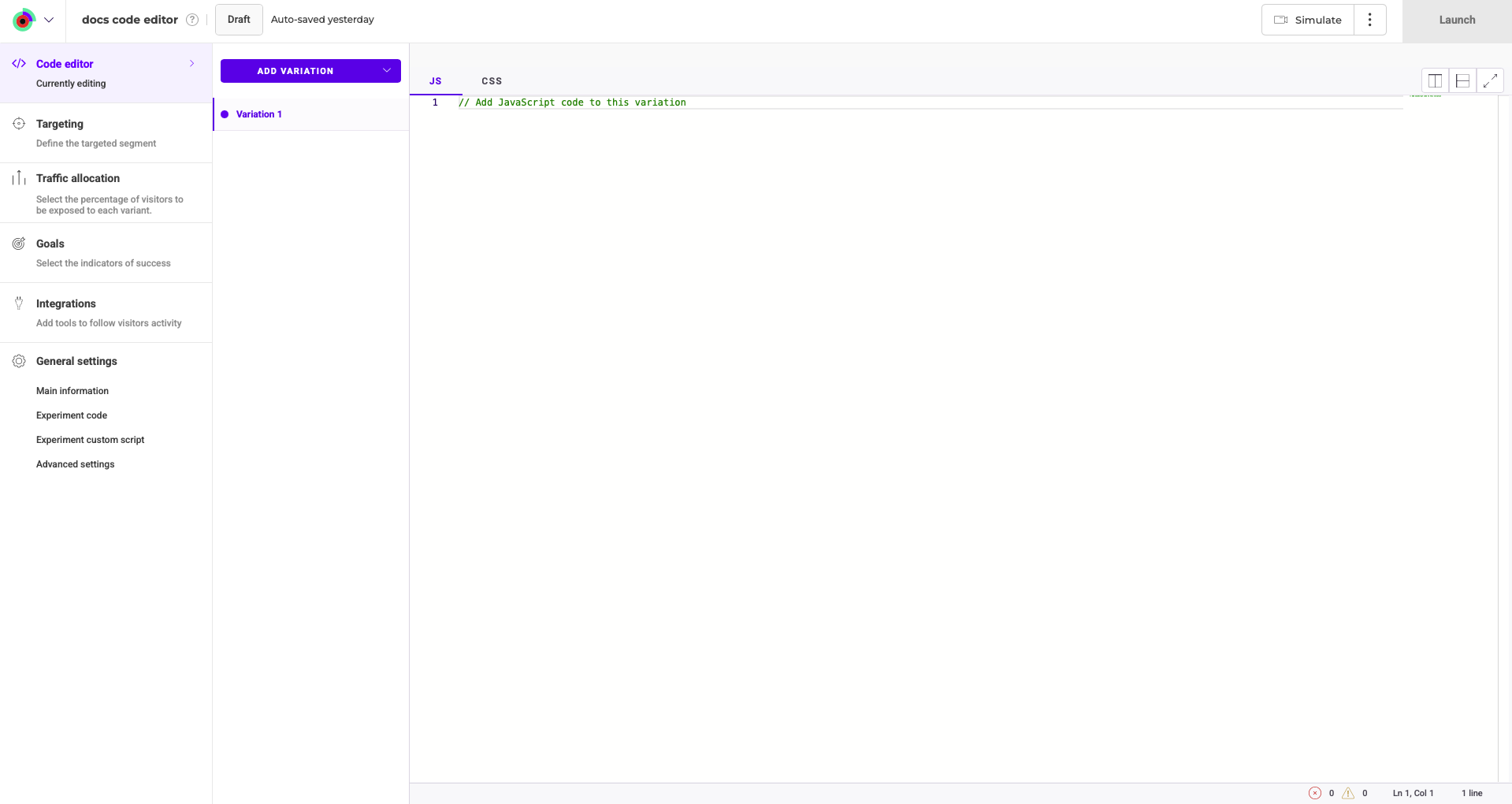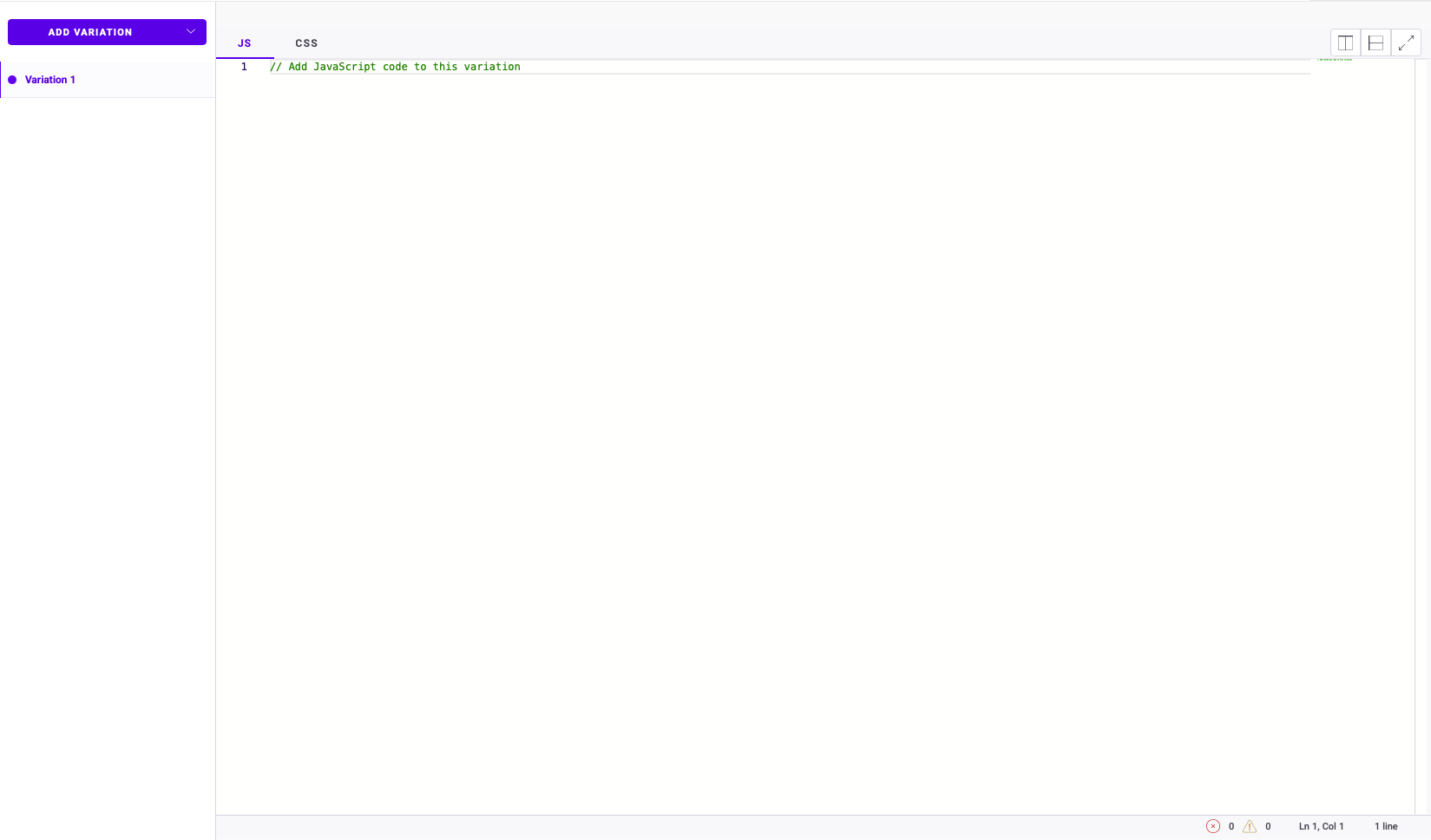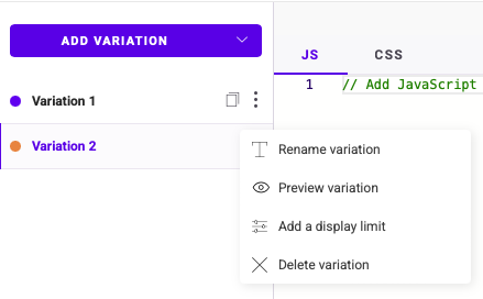 - Code area: You can edit JavaScript (JS) or CSS code specific to the selected variation. Includes tabs to toggle between JS and CSS.