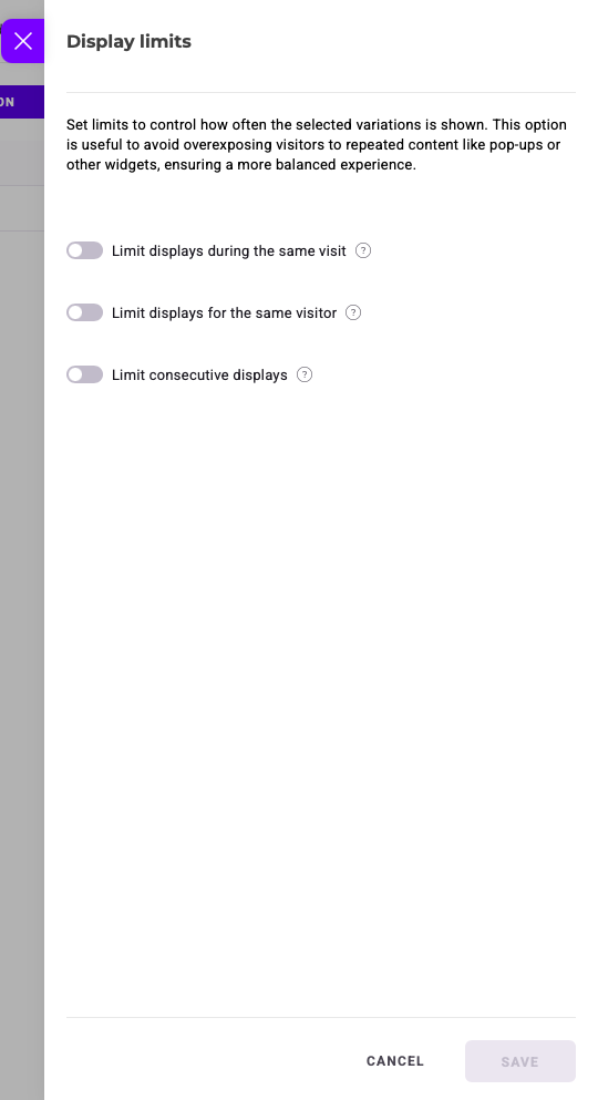 Click Add a display limit to control how often a variation is shown. Enable any limits you'd like. Hover over the ? icon to display a tooltip providing more information about a limit.