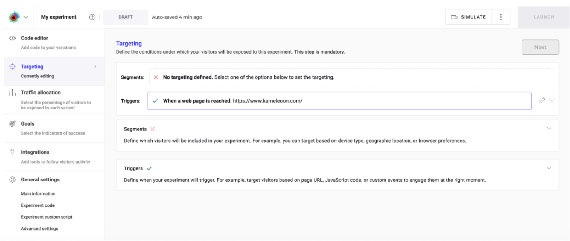 When you open the Targeting page, the trigger is automatically set to the website URL you specified when creating the experiment.