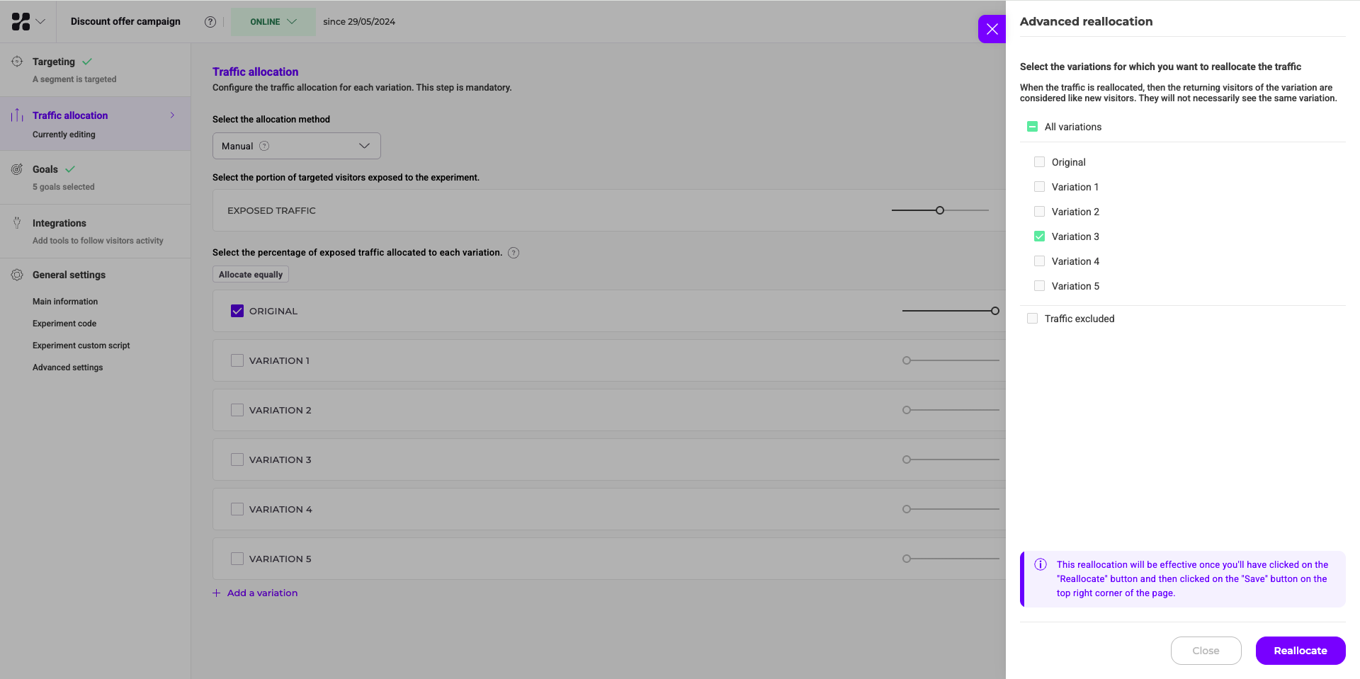 Use Advanced reallocation to redistribute traffic among variations in your experiment. When you apply this feature, Kameleoon resets the traffic allocation and treats returning visitors as new visitors. This is useful for focusing on specific variations or excluding others from further traffic.