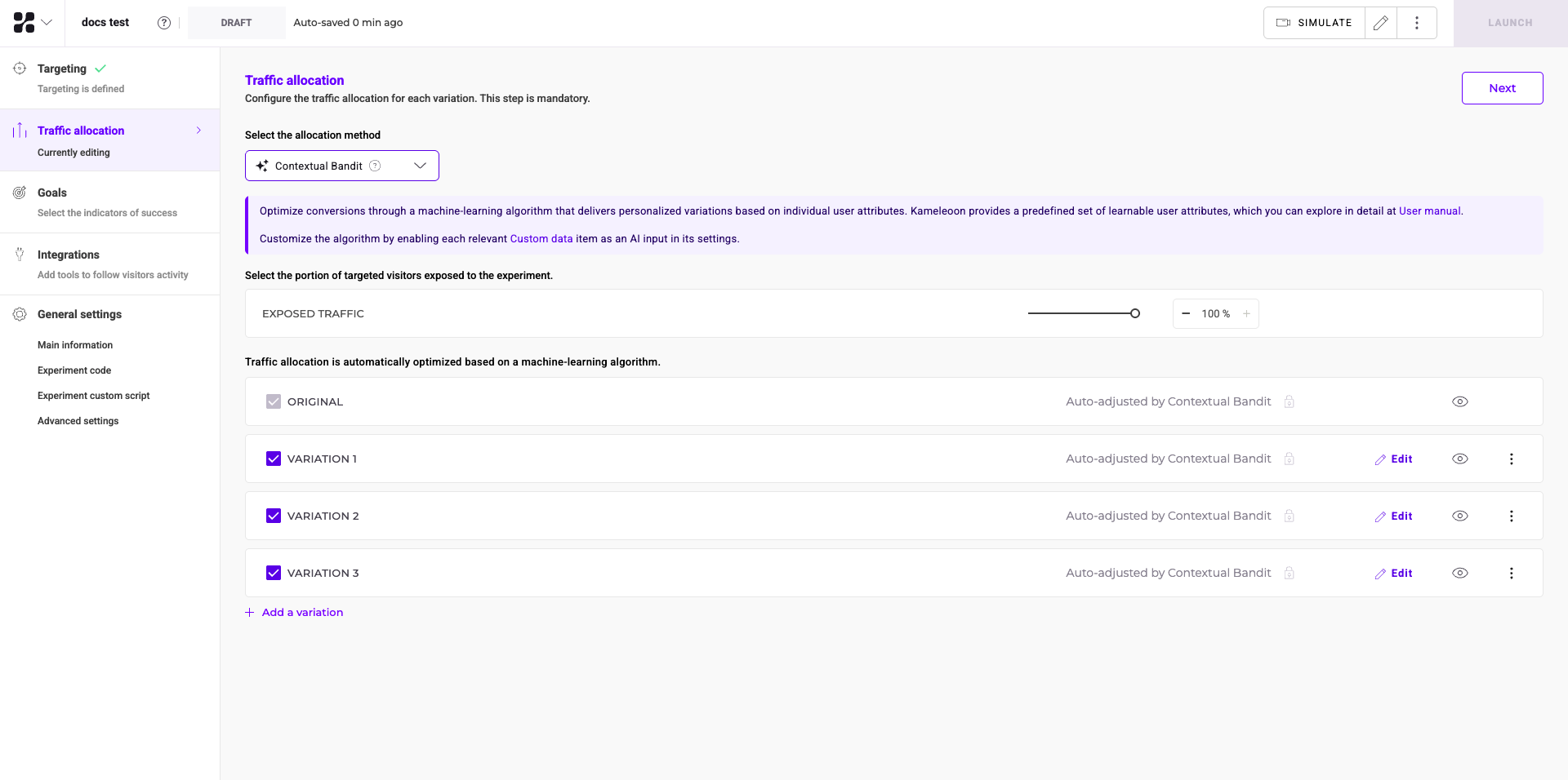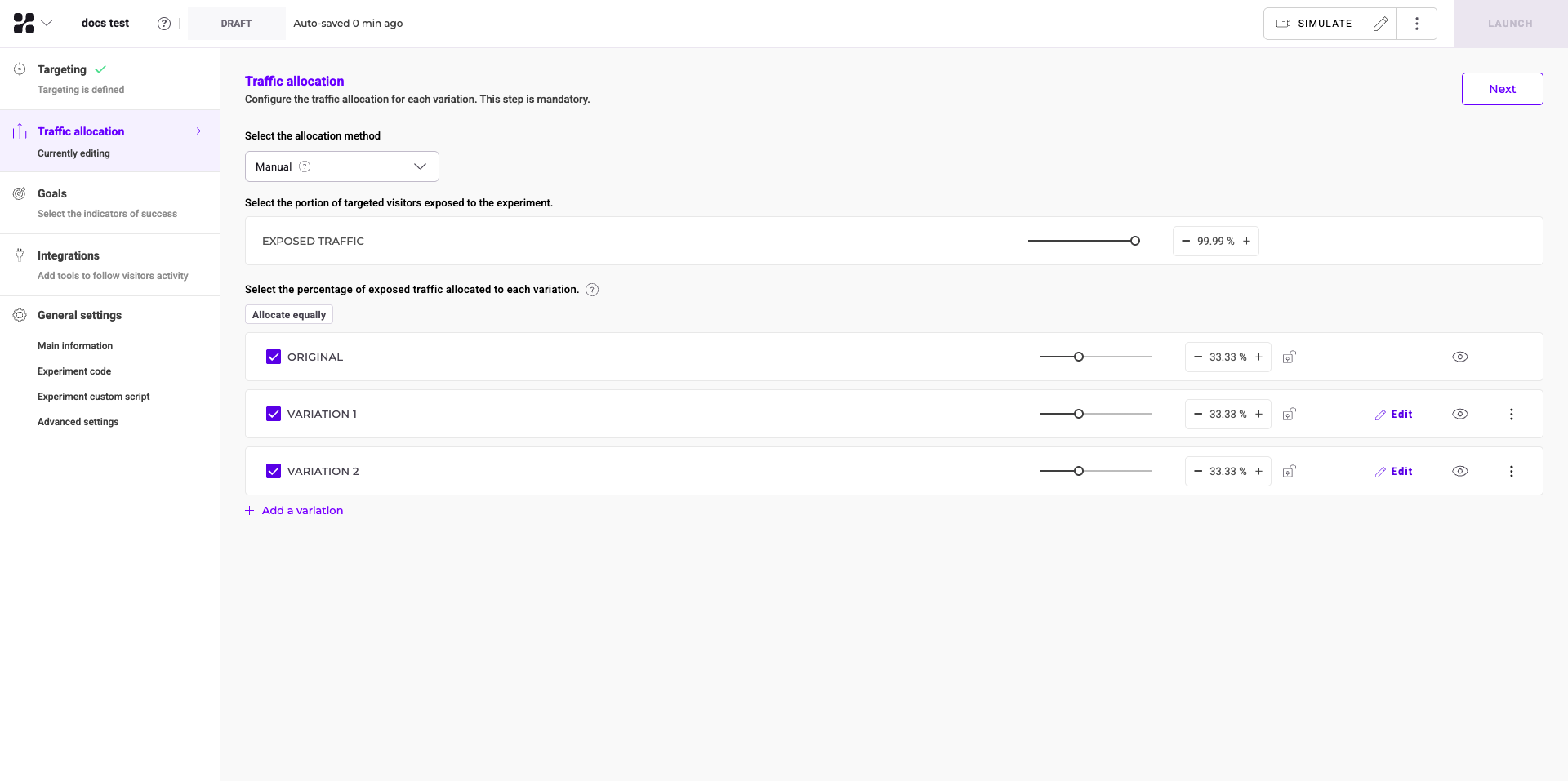 The second step is traffic allocation. By default, Kameleoon distributes traffic evenly among variations, but you can change this setting.