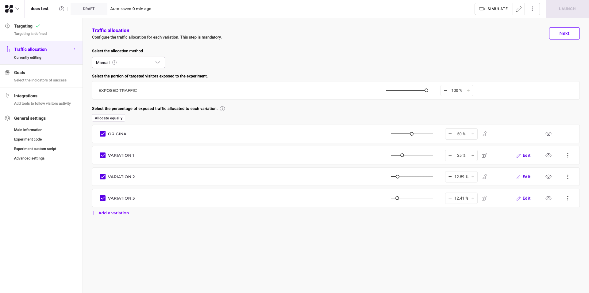 To allocate different percentages to each variation, use the sliders to adjust the values.