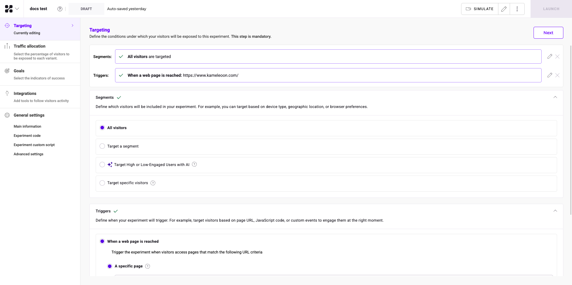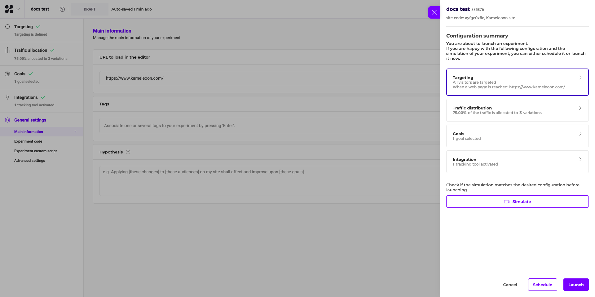 Kameleoon recommends simulating your experiment before you launch to verify the display, targeting, and goal conversions.