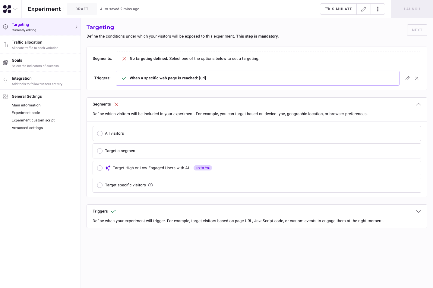 The first step in finalizing your A/B experiment is defining targeting. You must outline the segments and triggers that comprise your targeting.