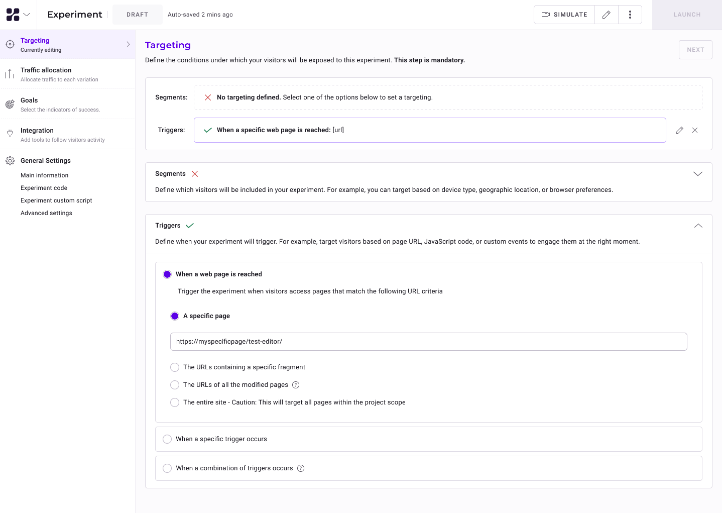 - A specific page: Trigger your experiment when a visitor lands on a particular page on your site. Enter the page's URL in the text field.